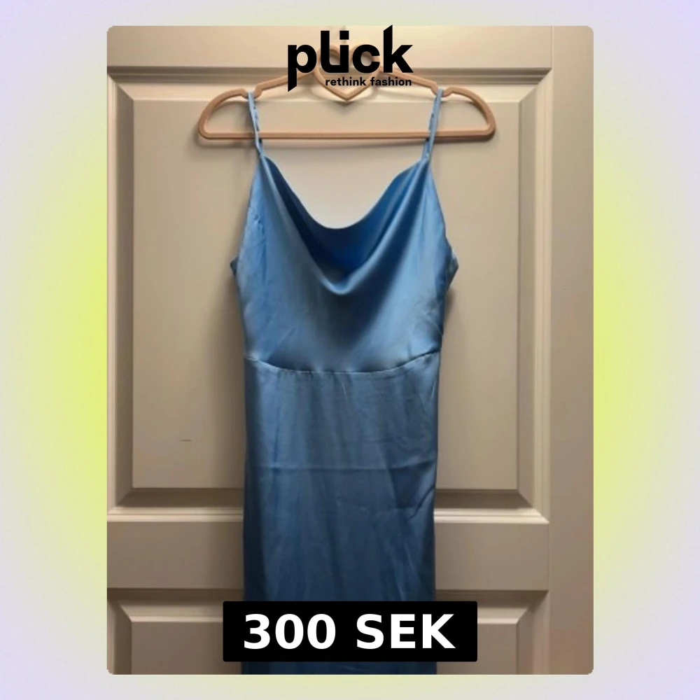 Säljer en elegant ljusblå balklänning med tunna axelband och draperad urringning. Klänningen har en slät, glansig yta och är figurnära i modellen. Perfekt för dig som vill ha en stilren och trendig look.