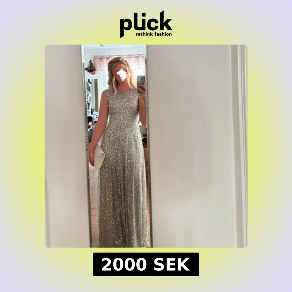 Säljer nu min fantastiska balklänning!✨💫🪩💃Den är silver glittrig med en beige-aktig underklänning🪩🪩 Den har det mest magiska fallet och har bara använts en gång!🥰 Jag sydde in den själv i ryggen för att få en öppen rygg (se bild 3), men den går att sy ut för att dragkedjan ska gå ända upp!🩷