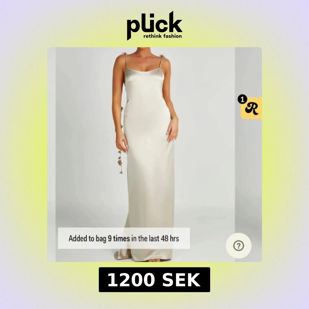 Supersnygg långklänning i champagnefärg med tunna axelband och öppen rygg. Klänningen har blommiga detaljer längs banden och är gjord i ett glansigt satinliknande material. Perfekt för dig som vill sticka ut med en elegant och trendig look. Helt ny, oanvänd med prislapp kvar!