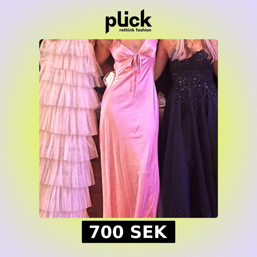 Säljer en elegant rosa långklänning med knyt framtill och baktill. Klänningen har en v-ringad design och är perfekt för speciella tillfällen. Materialet ser ut att vara mjukt och följsamt, vilket ger en fin passform. Använd en gång