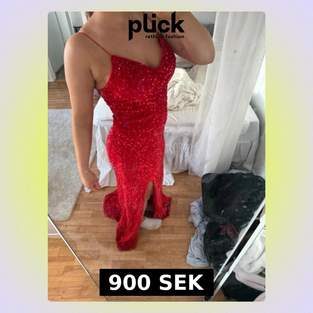 Snygg röd långklänning med smala axelband och glittriga paljetter över hela klänningen. Klänningen har en slits framtill och snörning i ryggen för en justerbar passform. Perfekt för bal eller festliga tillfällen.