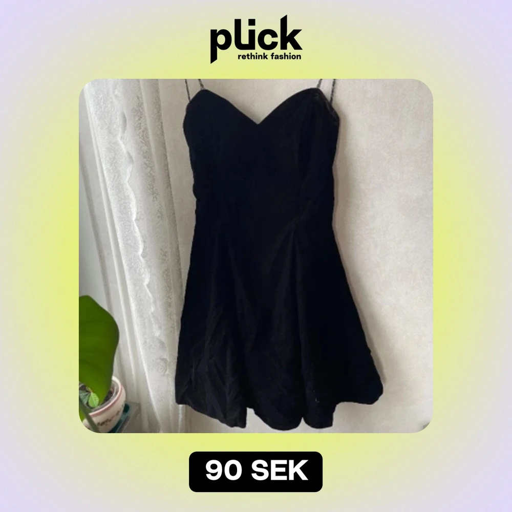 Svart cocktailklänning med tyll underkjol, sammet och spetsband. Strukturerad korsett modell OBS-missfärgning (se bild) och axelbanden är slitna Köpt för 800kr på Beyond Retro