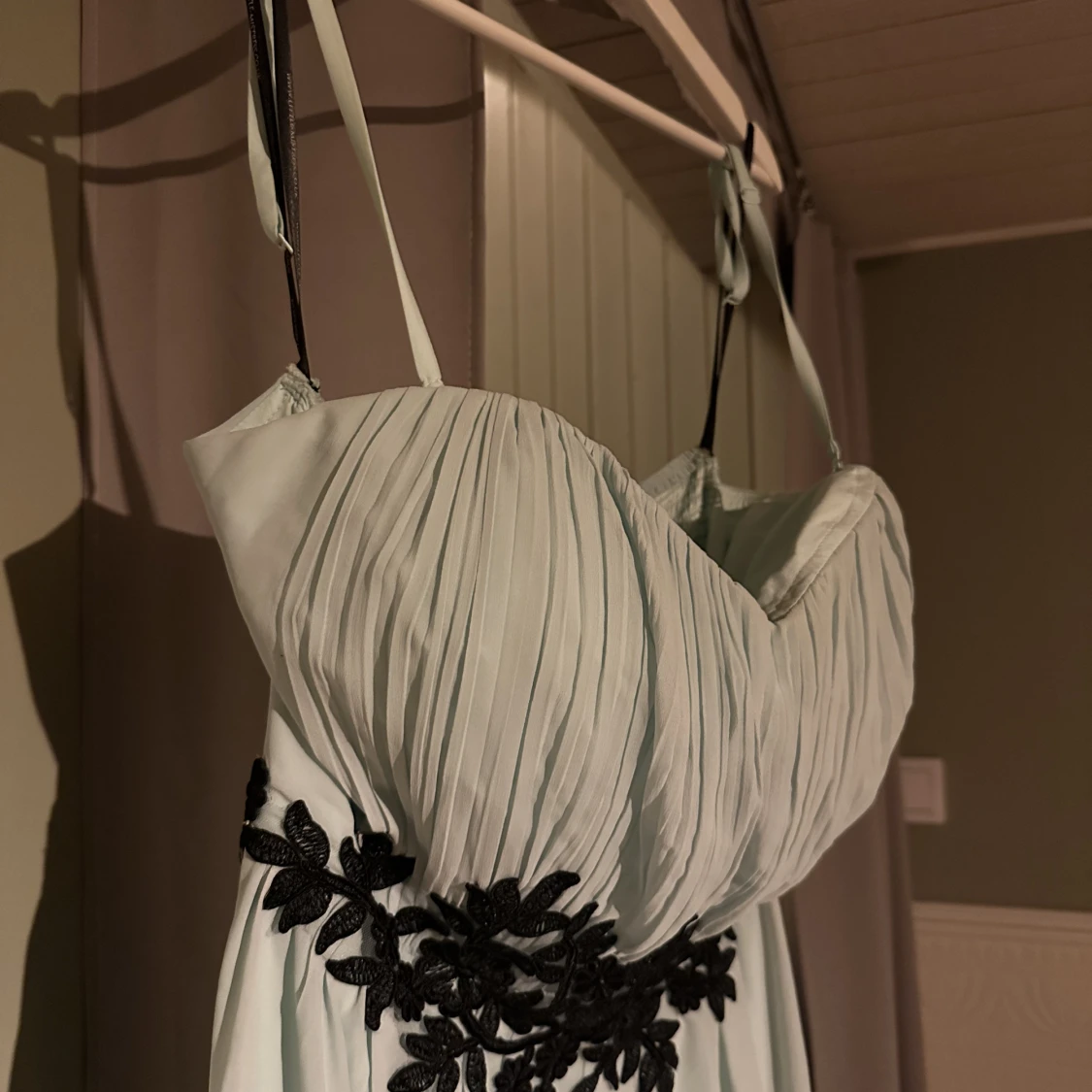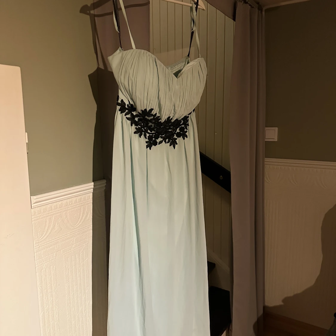 mintgrön klänning med svarta spetsdetaljer vid midjan använd en gång finns löstagbara axelband