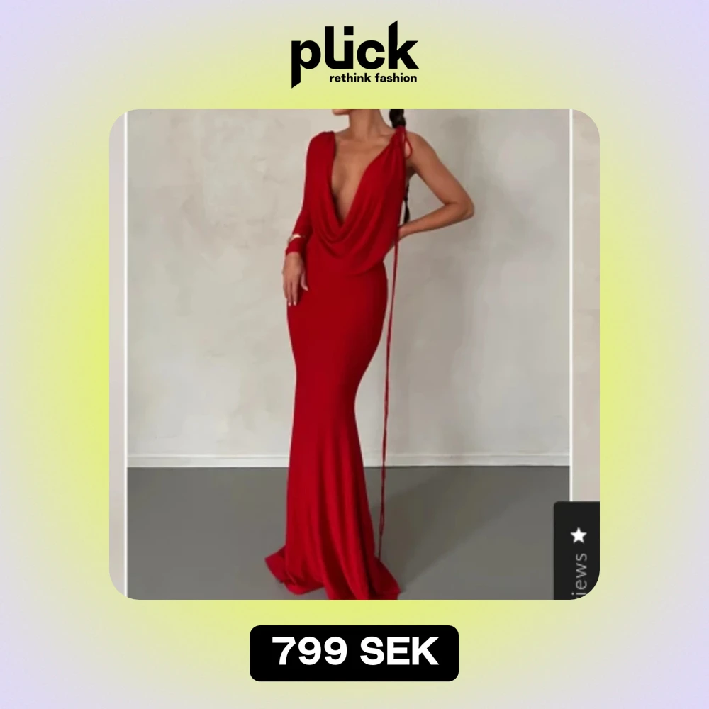 En röd långklänning med en arm, den går att använda åt vilket håll man nu skulle föredra, antingen öppen framtill eller baktill. Den har långa snören som blir en snygg detalj. Skulle varit min balklänning men den kom inte i tid, så fin annars!