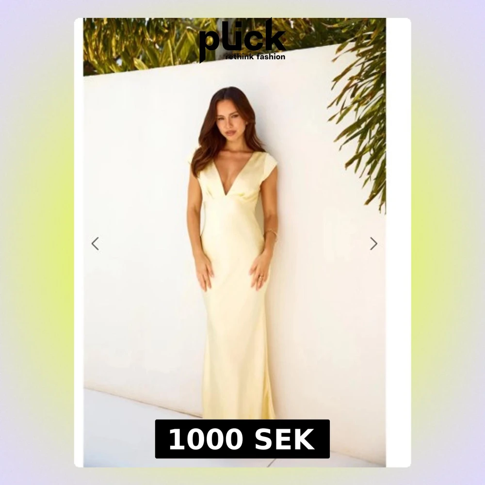 Elegant ljusgul långklänning med djup v-ringning och öppen ryggdetalj. Klänningen är endast använd en gång och därav i väldigt fint skick. Perfekt till balen!💓