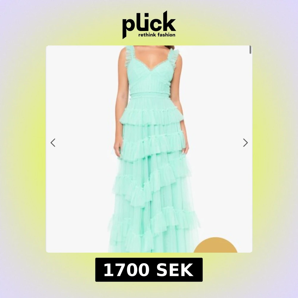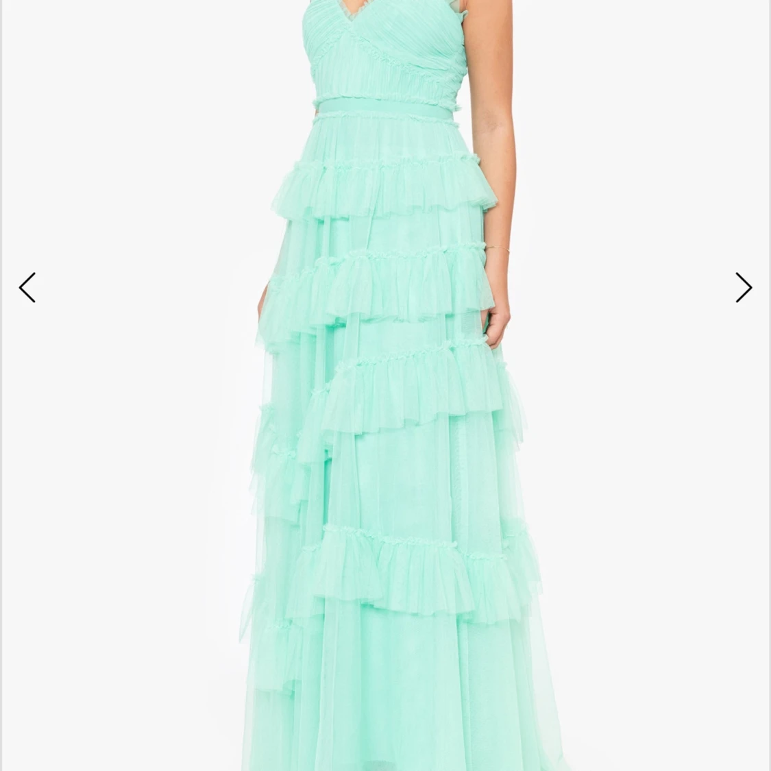 Superfin långklänning i mintgrönt med flera lager volanger och v-ringad hals. Axelbanden är breda med volangdetaljer och klänningen har luftig känsla. Perfekt för bal! I storlek 6 passar s/m.
