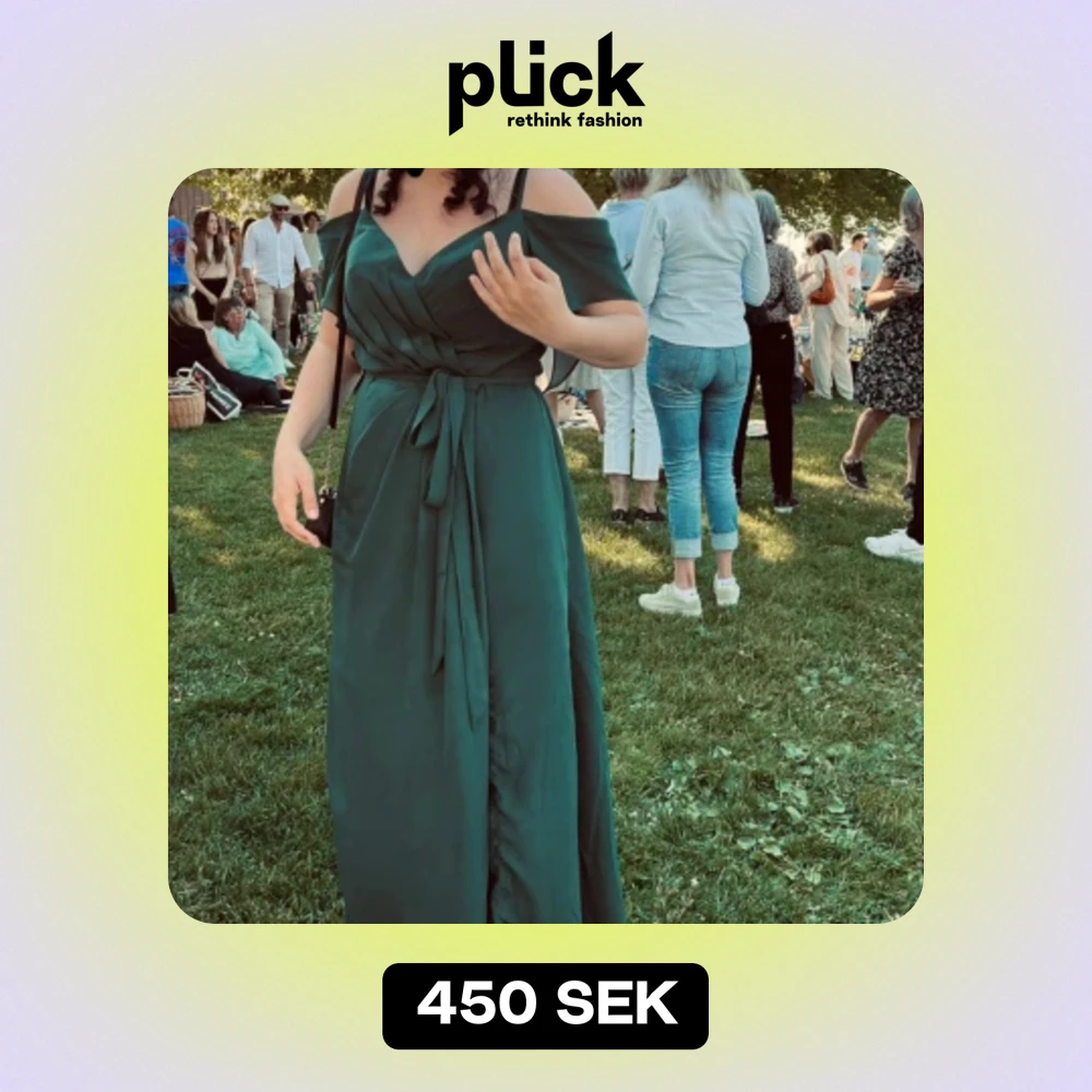 En grön klänning. Den är i storlek 42, men var för stor på mig, var lätt att justera dock då man kan dra åt klänningen med "skärpet". Den har en slits upp till låret.