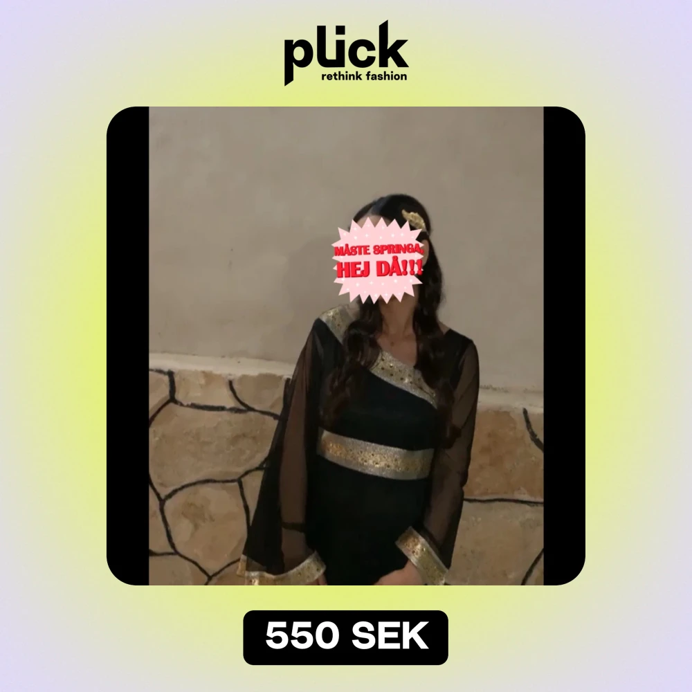 Elegant svart långklänning med gulddetaljer. Klänningen har en oneshoulder-design och långa, genomskinliga ärmar med guldkant. Perfekt för festliga tillfällen! Använd 1 gång, stolen s