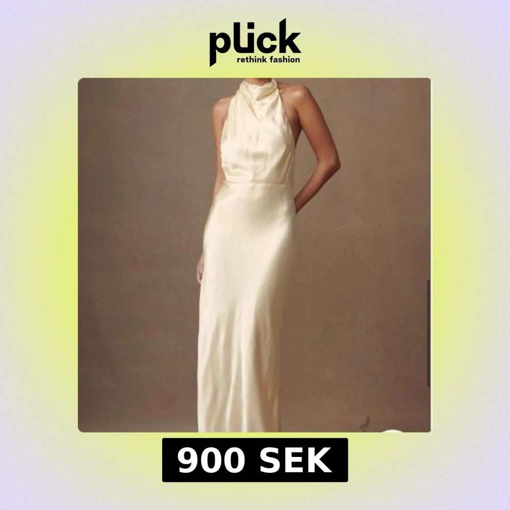 Jättefin långklänning i champagne/ljusgul färg med halterneck och öppen rygg 💛Fin till bal 🤩Aldrig använd och säljer då den inte kommer till användning. Köpt för 1600kr