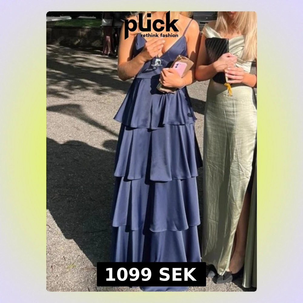 Säljer min jättefina marinblåa balklänning i satin. Nyskick, använd en gång och kemtvättad. Insydd i kupan men går att sprätta upp.