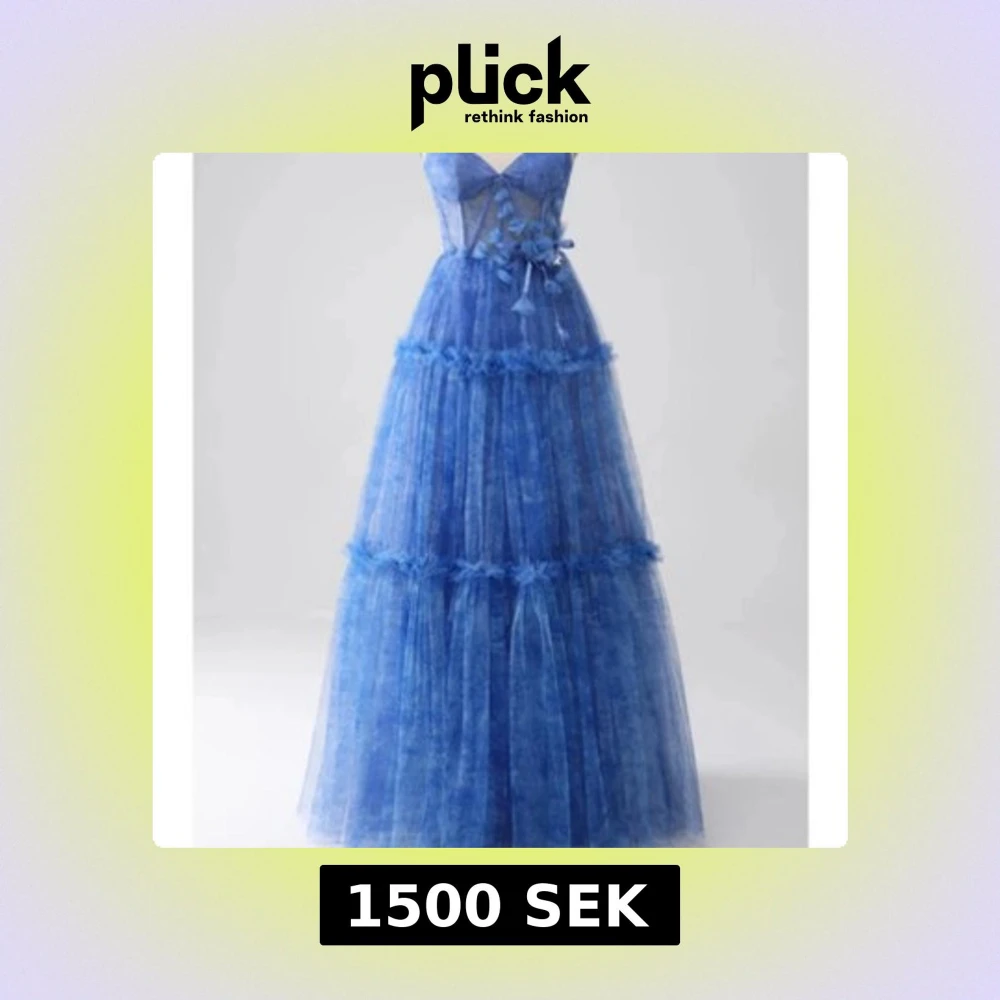 Säljer en blå långklänning med transparent tyll, volanger och dekorativa blommor framtill. Klänningen har smala axelband, markerad byst och glittriga inslag i tyget. Perfekt för bal eller festliga tillfällen. Gå gärna in på Vinted och köp, mycket smidigare leverans och betalningsmetod! - sessaskogen där