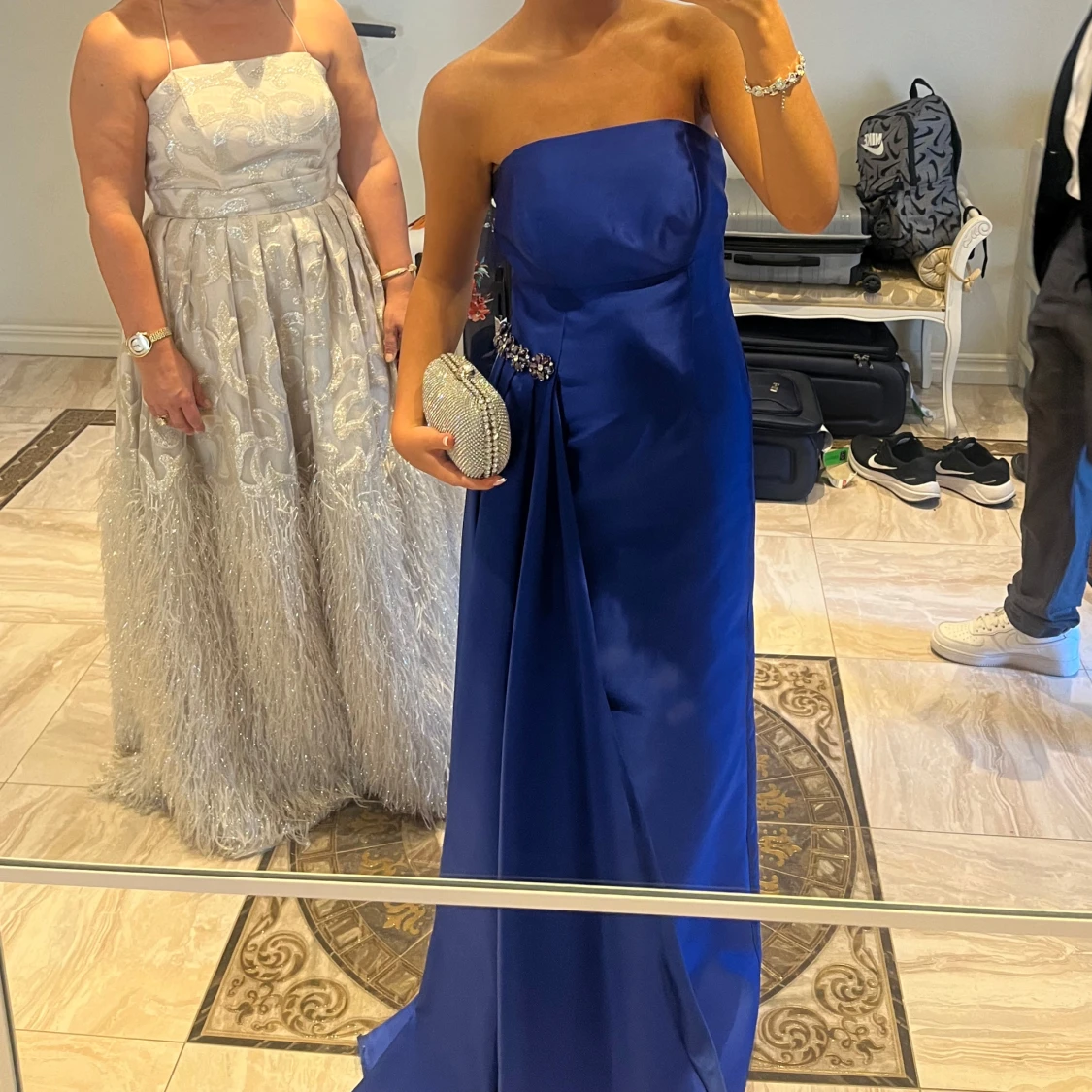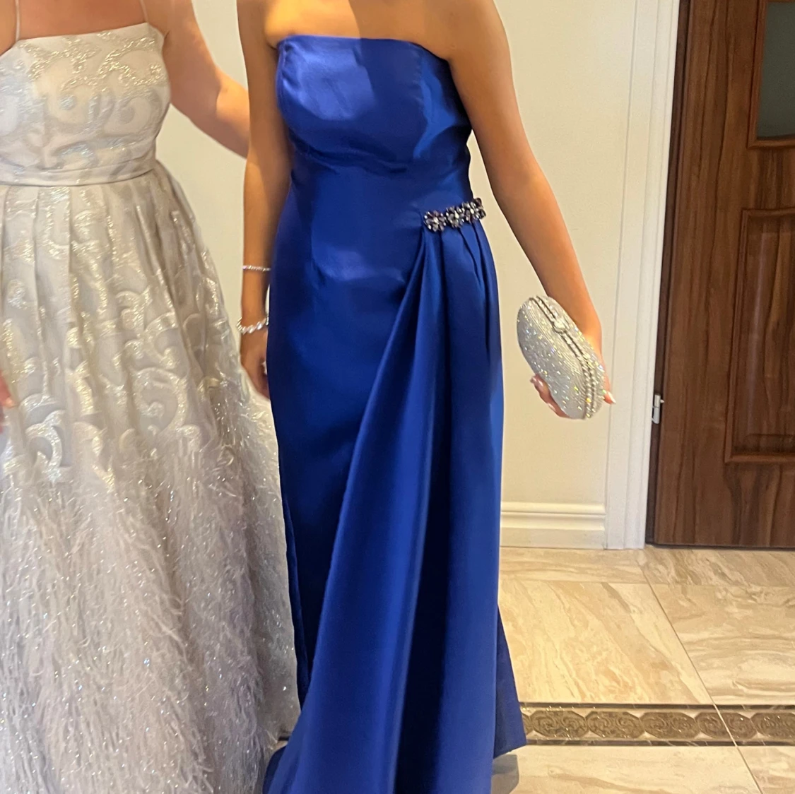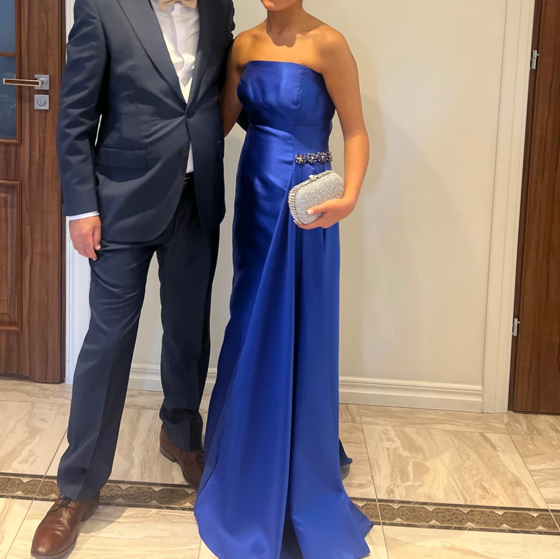 Skitsnygg balklänning köpt från Spanien💙klänning har en ”slöja” och slits vid kanten💙använd endast en gång och är i perfekt skick☺️om ni vill ha fler bilder och längden på klänningen, skriv privat💙