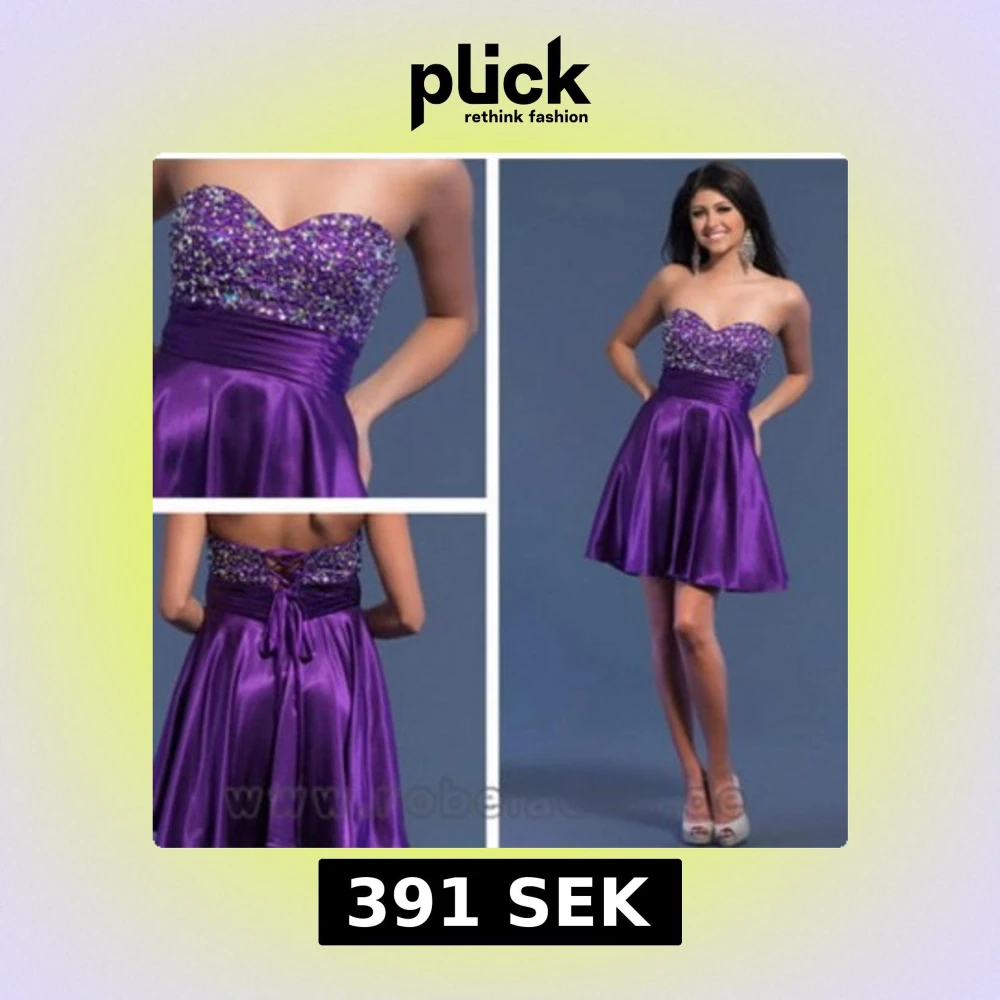 Snygg lila klänning från Dave & Johnny med glittriga paljetter och stenar på överdelen. Kjolen är kort och har en vacker glansig finish. Perfekt för festliga tillfällen! Man kan använda den med eller utan axelband. Det kommer med extra plaketter och prälor ifall några skulle lossna. Storleken är lite flexibel. Skulle säga att den är mellan 36 och 40.