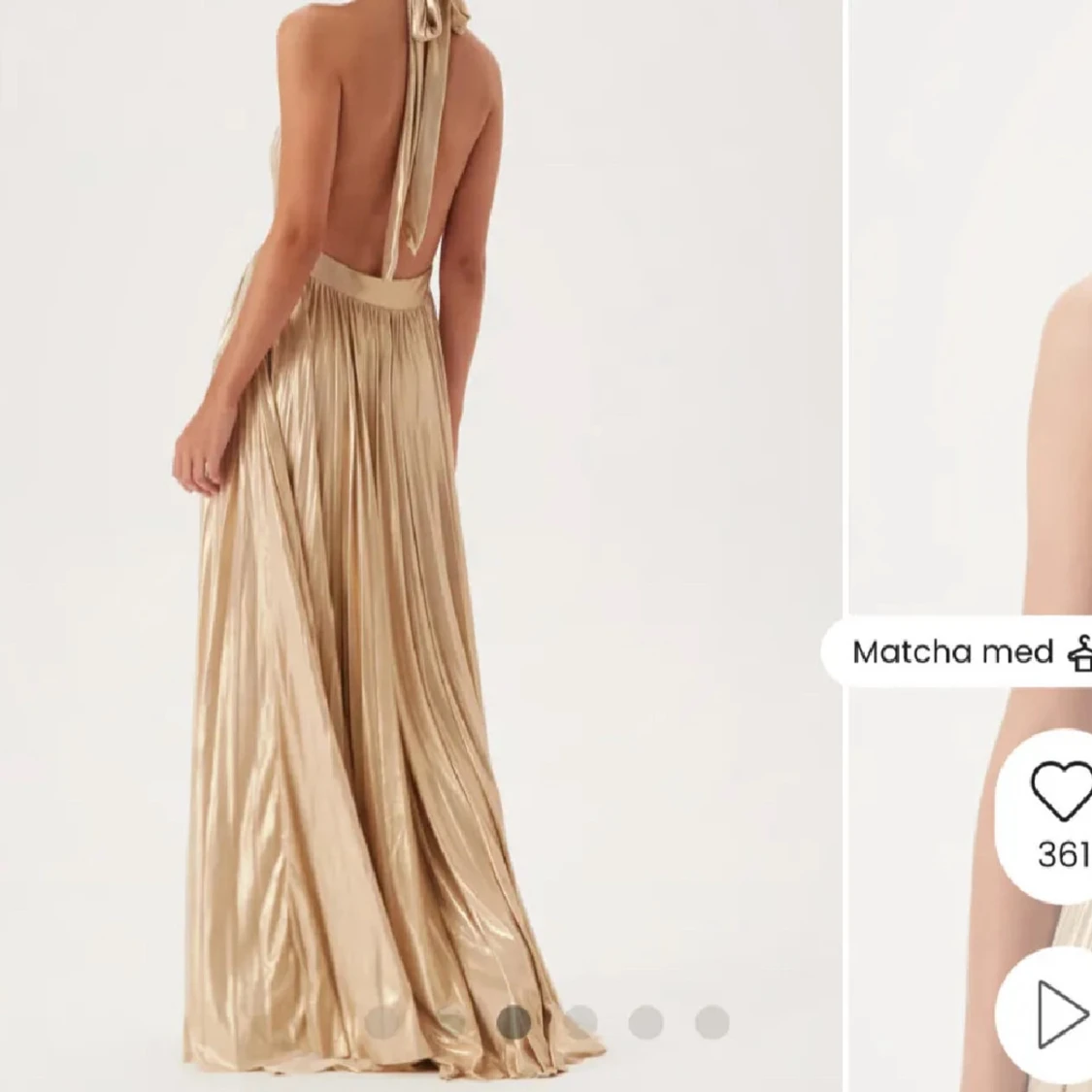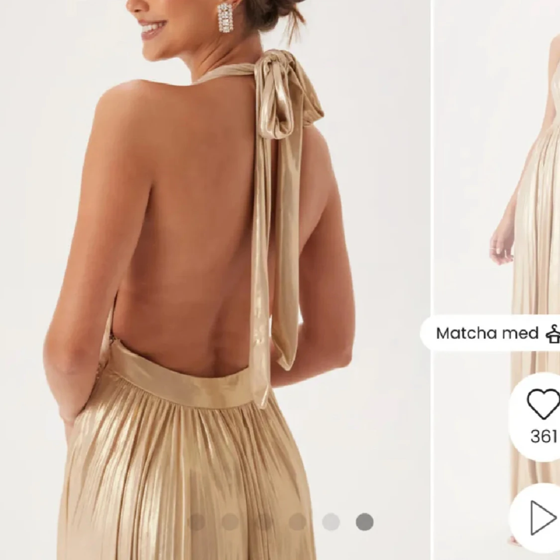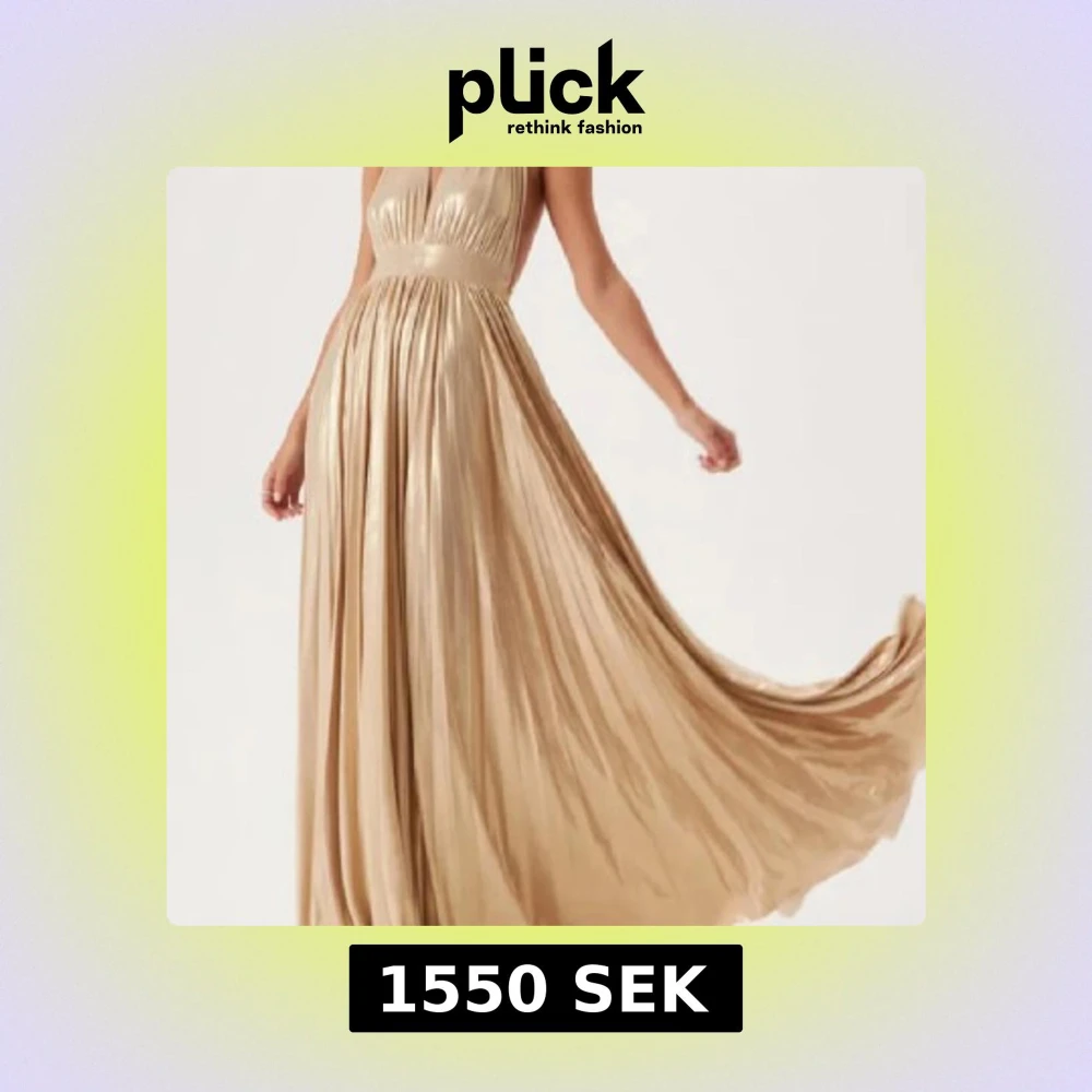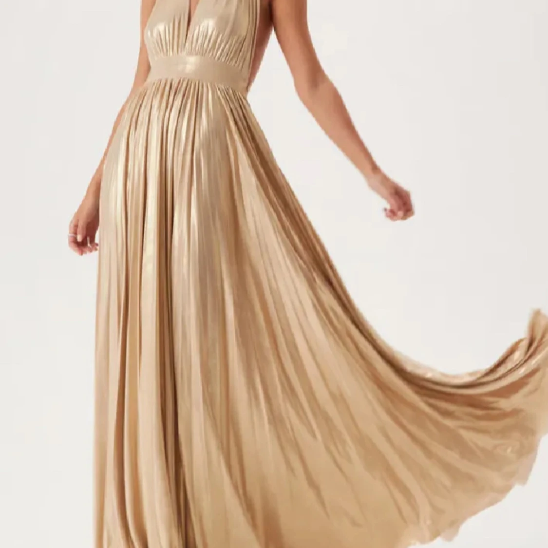 Säljer en glansig champagnefärgad långklänning med plisserad kjol och djup v-ringning. Klänningen har öppen rygg och knyts med en stor rosett i nacken. Materialet är skimrande och ger en lyxig känsla, perfekt för bal eller fest. Supersnygg och elegant look!använd 1 gång