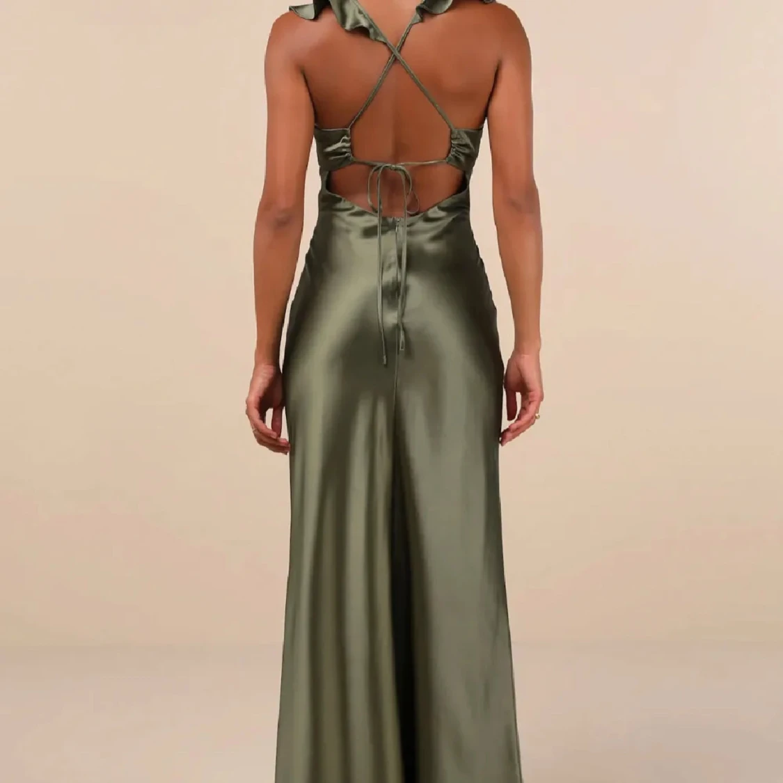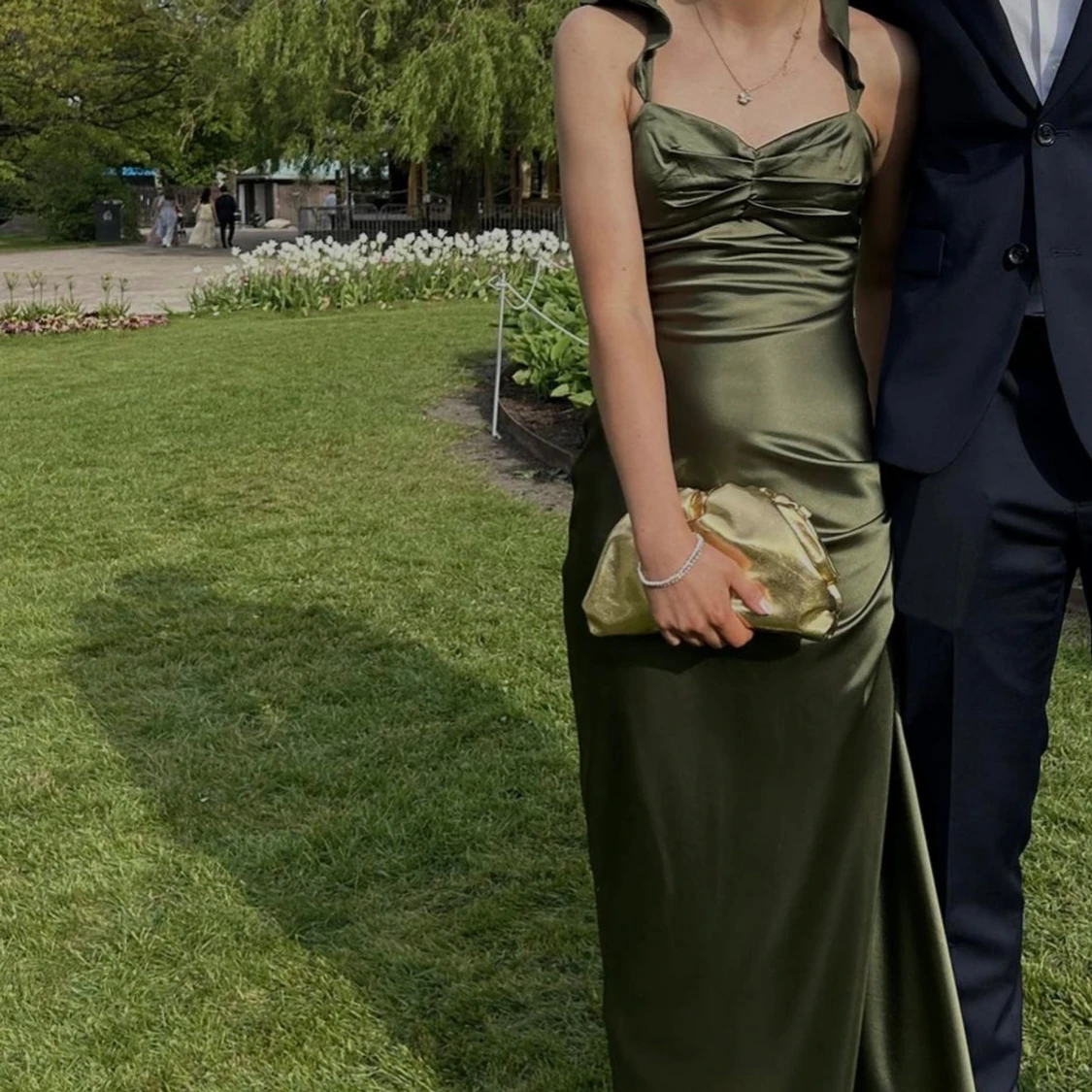 Jääääättefin olivgrön balklänning i satinmaterial, endast använd en gång, har dock en liten defekt på tyget men den syns knappt. Den är även uppsydd längst ner för att passa någon som är runt 158-160!! Köpt för 1300kr på plick och då var den oanvänd!