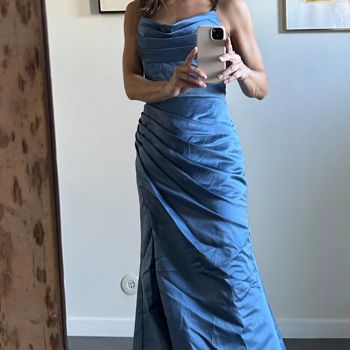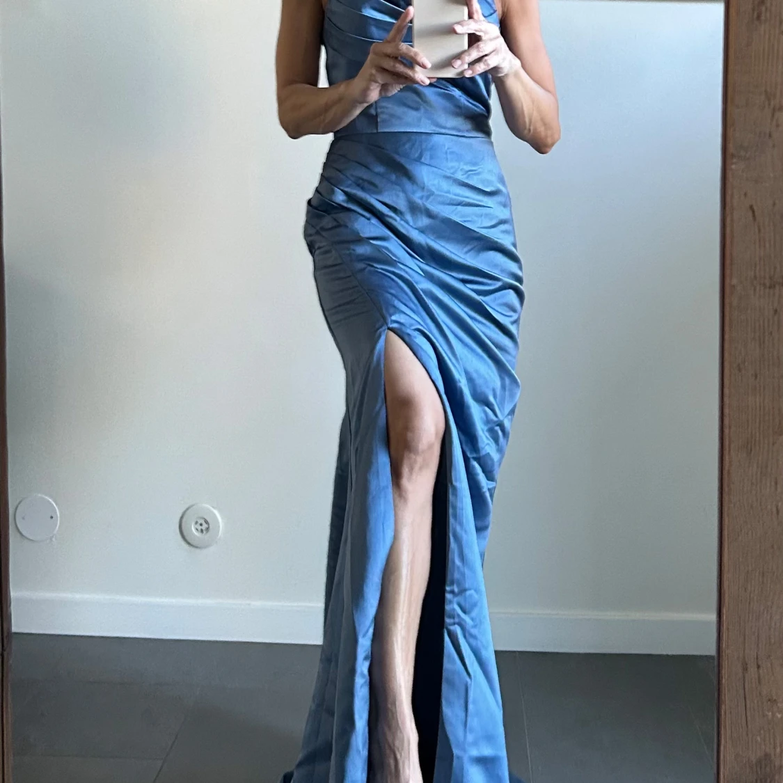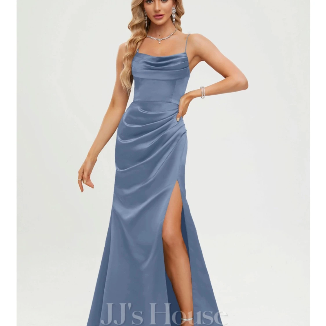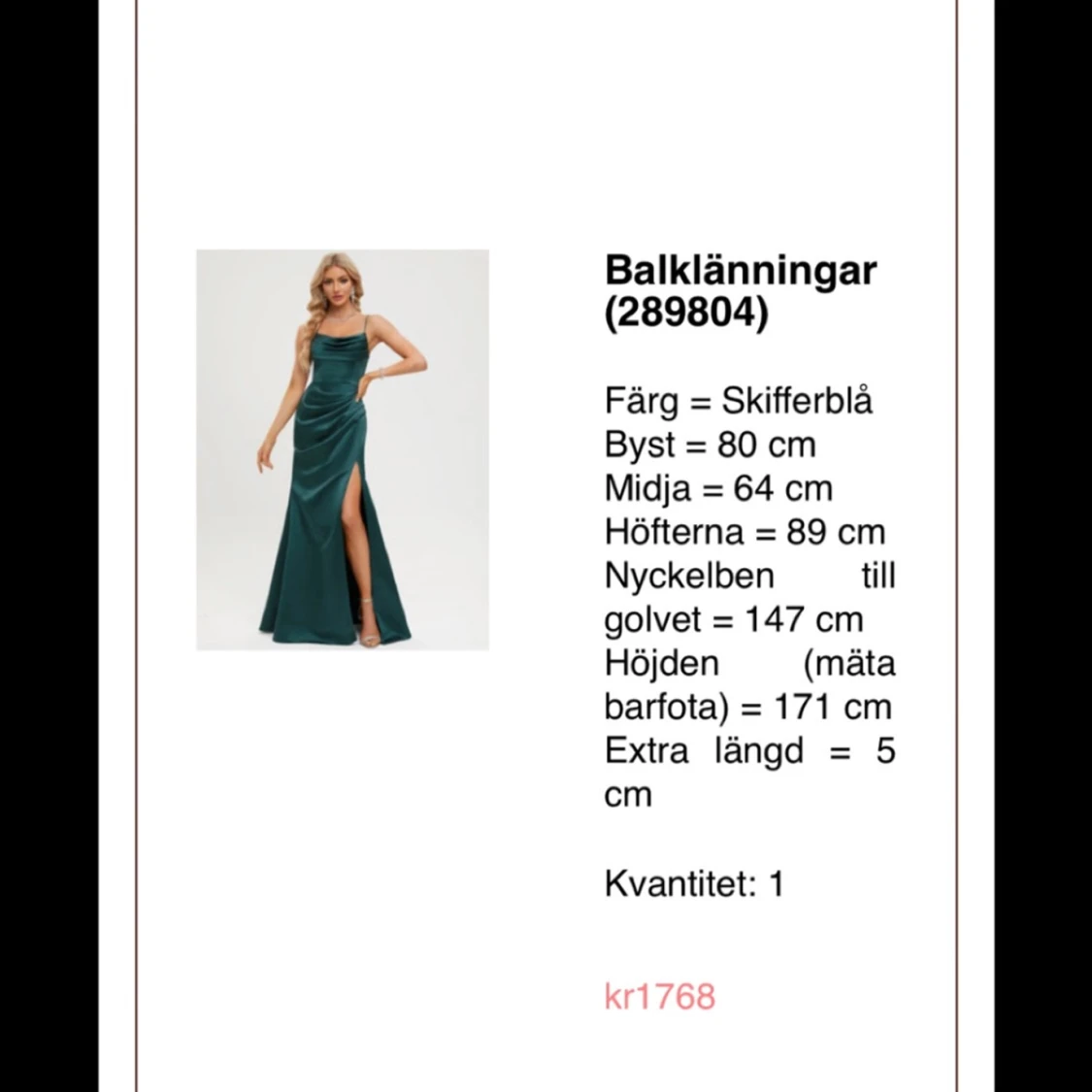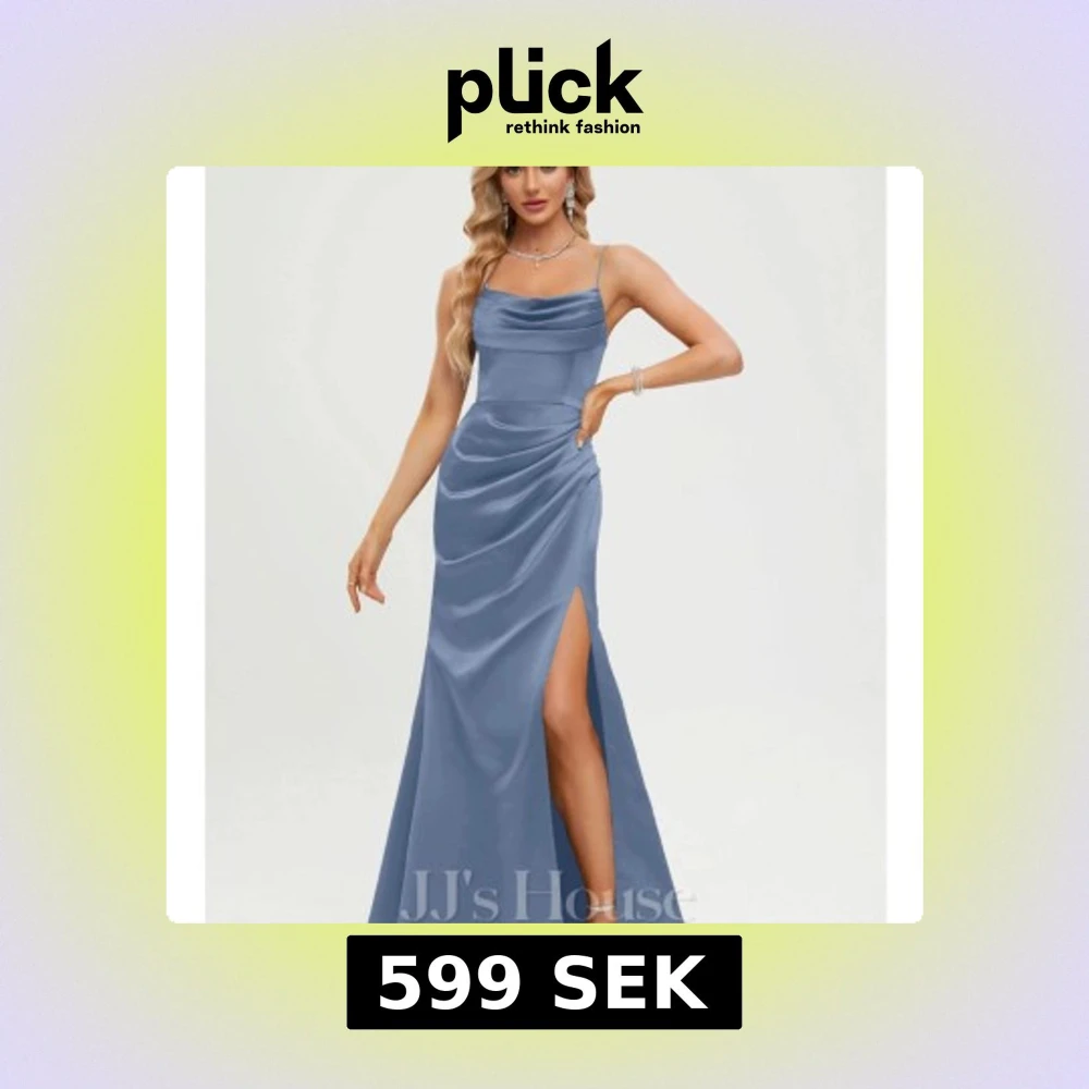 Balklänning från JJ’s House i färgen skifferblå. Golvlång med slits och inbyggd bh. Aldrig använd. Köpte den på Plick till min dotter men den var något för stor. Nypris 1768kr, säljer för 500kr. Mått finns på andra bilden.