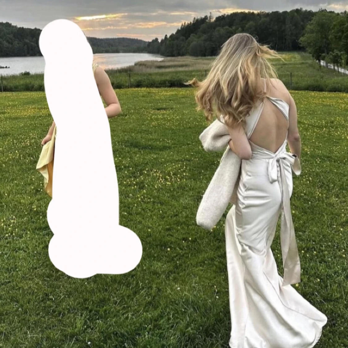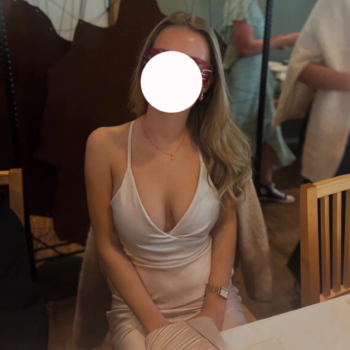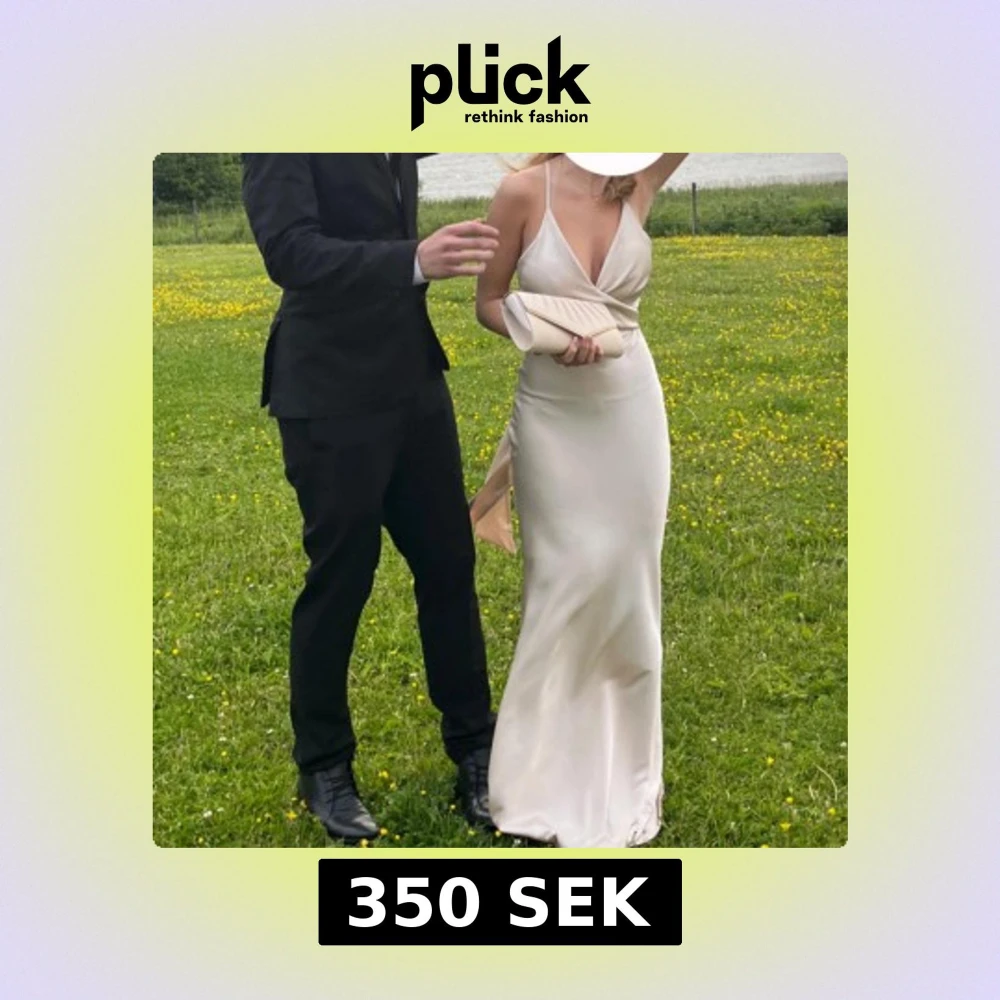 Elegant långklänning i champagnefärgad satin med djup v-ringning, smala axelband och öppen rygg med knytband. Klänningen har en figurnära passform och faller snyggt längs kroppen. Perfekt för bal eller festliga tillfällen. Använd 1 gång.