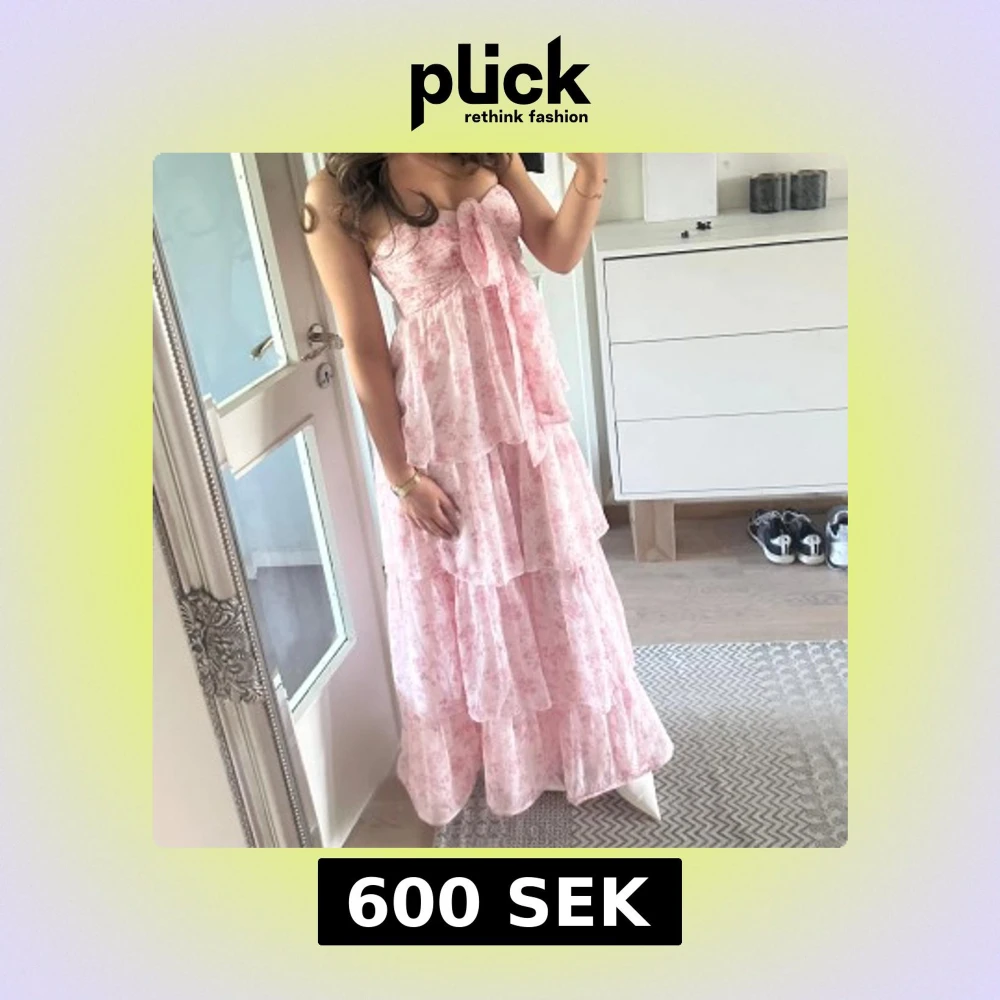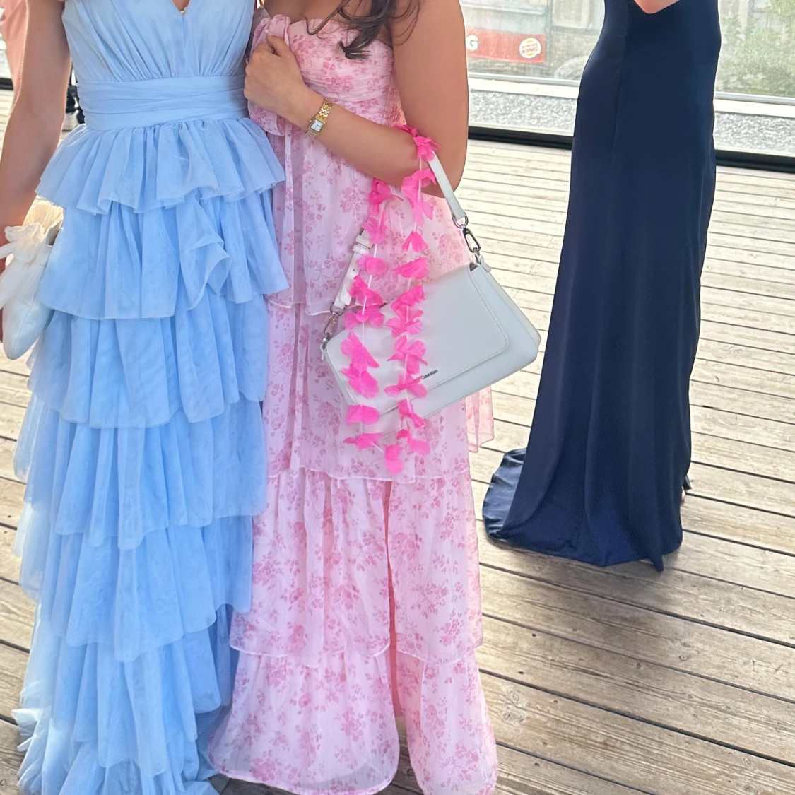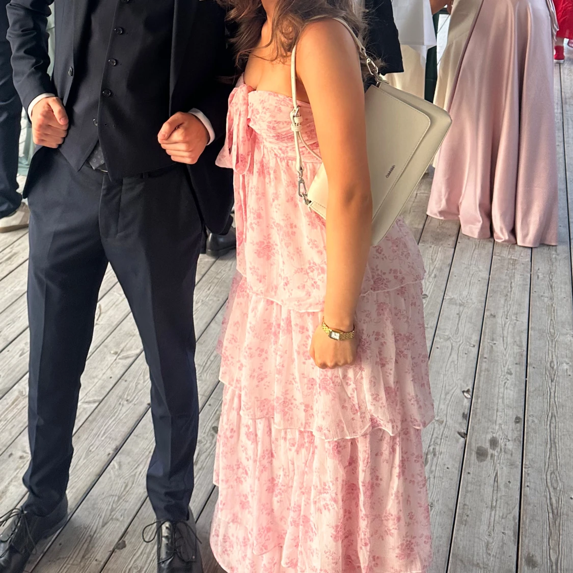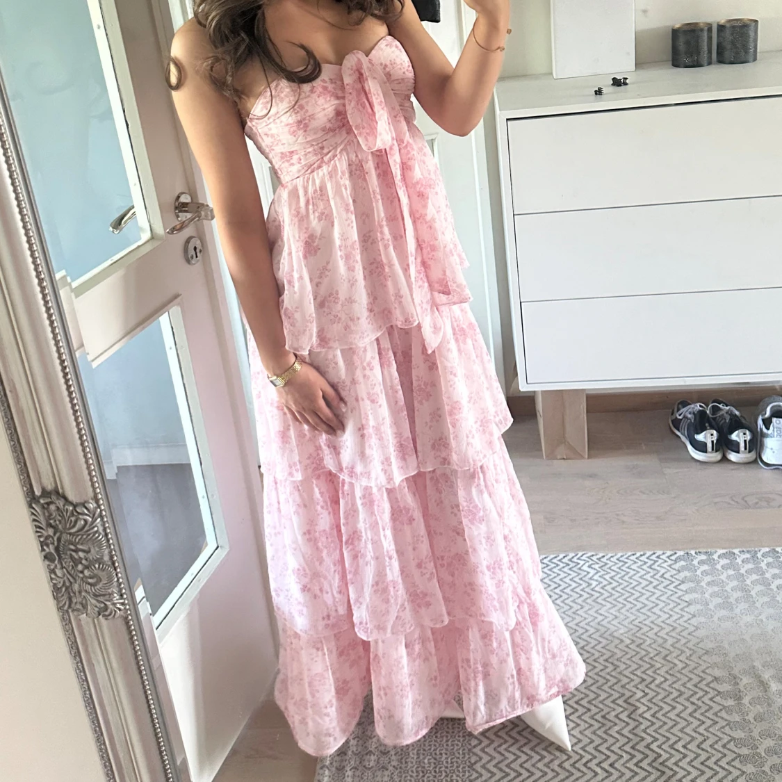 ljusrosa långklänning med blommigt mönster och flera lager volanger. Axelbandslös modell med söt rosett framtill och flowig passform. Perfekt för sommarens alla tillfällen när du vill känna dig extra fin. Har sytt upp den då den var för lång, skulle säga att den passar även kortare personer. 155-170. Pris går att diskuteras.