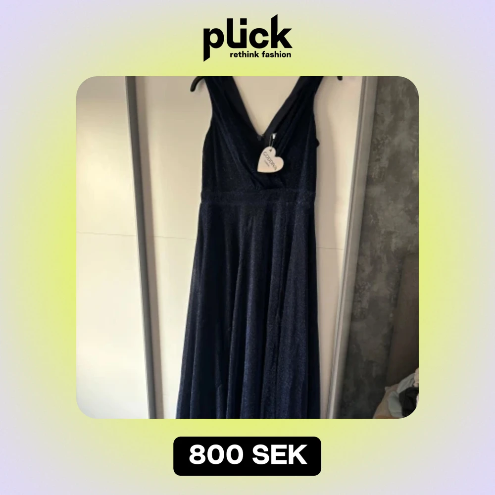 Balklänningen är mörkblå med glitter i och är helt oanvänd med ettiken fortfarande kvar, den är köpt på bubbleroom och är i storlek L