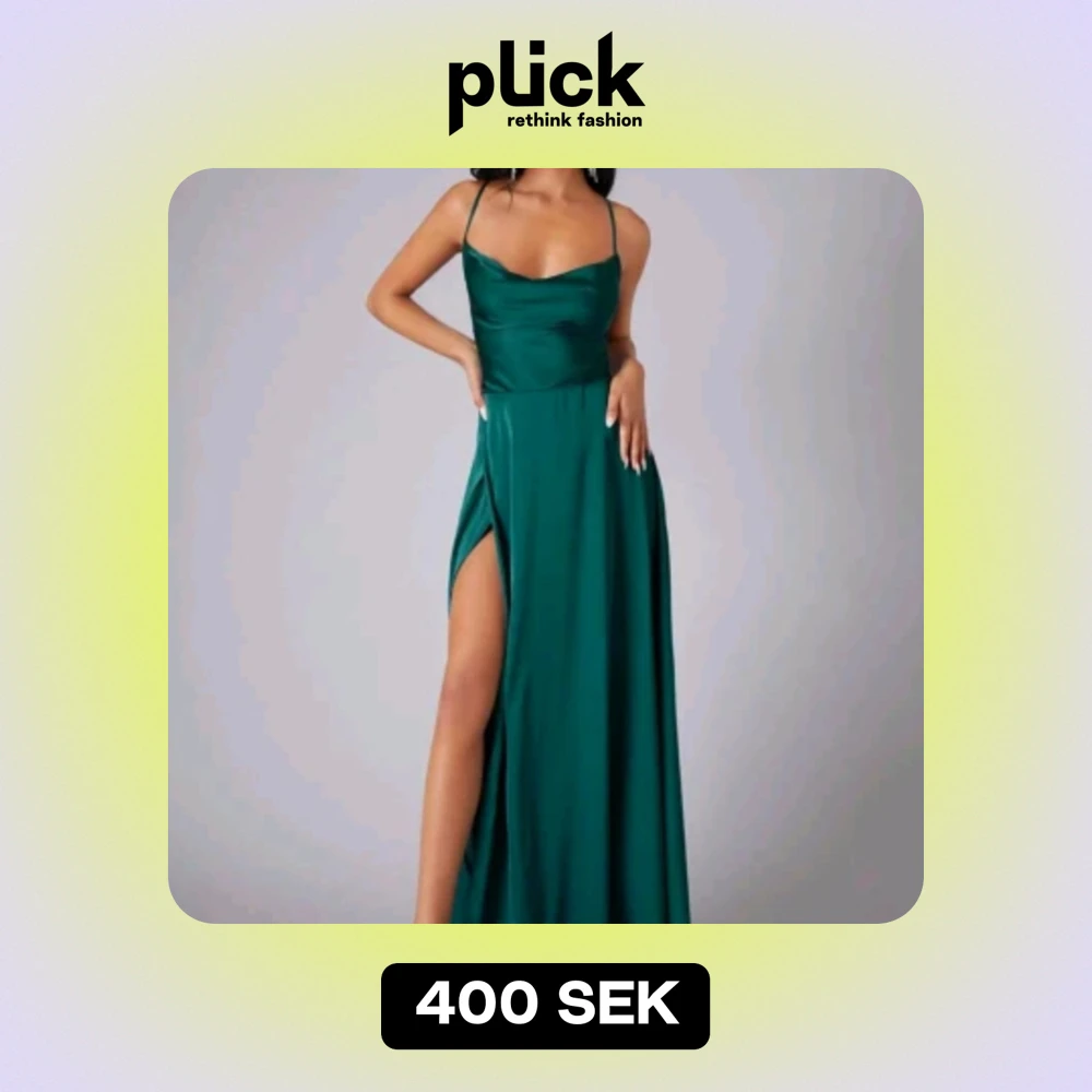 En mörkgrön super fin balklänning. Har använts endast en gång i typ 3 timmar bara. Långklännging med en fin slits på benet och är öppen i ryggen med snörning, går jättebra att spänna om det behövs. Säljer pågrund av inget som kommer att användas mer.