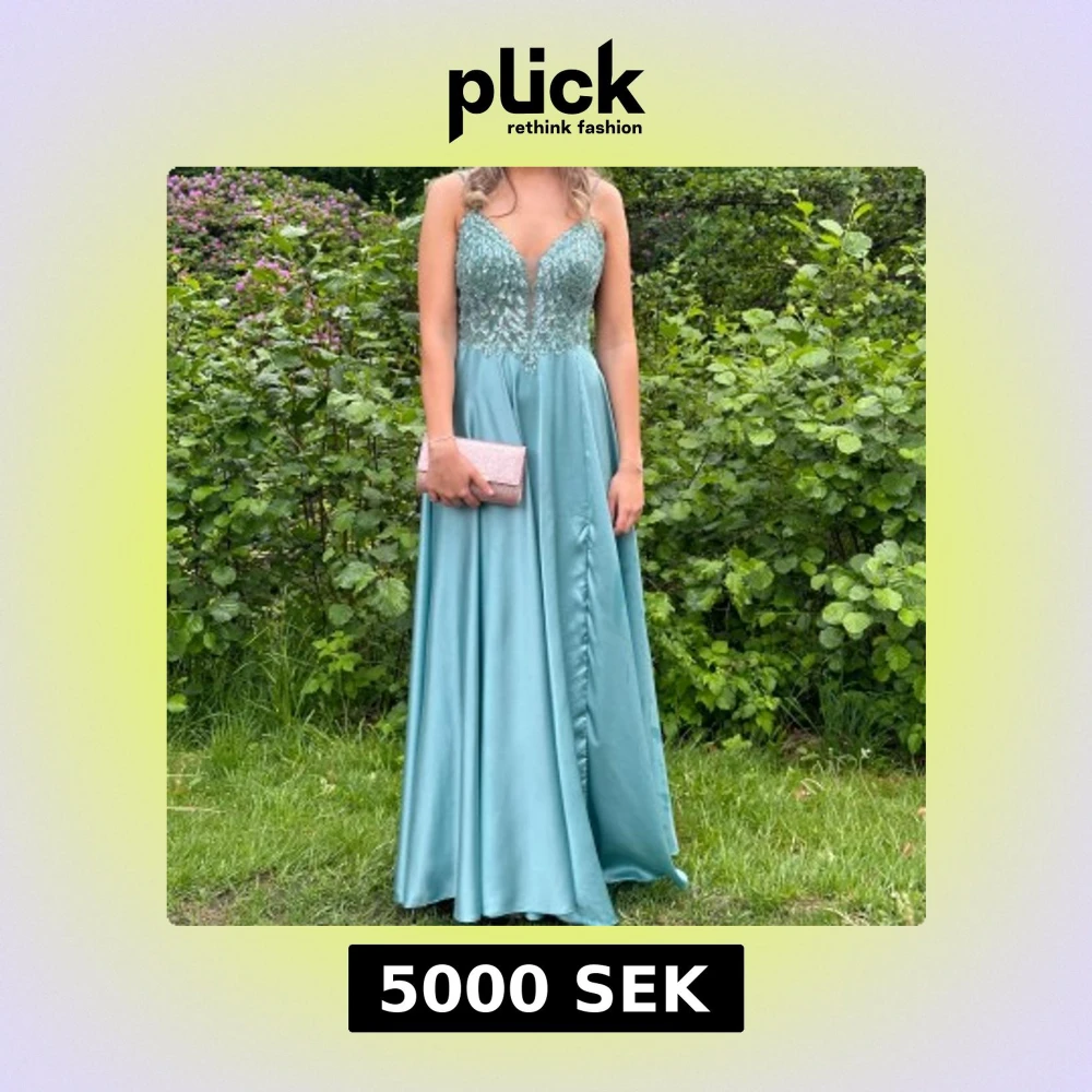 Jag säljer min vackra turkosa balklänning med glittriga paljetter och handbroderade detaljer. Klänningen har v-ringad urringning, tunna axelband och ett flowigt satintyg som faller fint. Klänningen är använd endast en gång och har efter användning tvättats professionellt hos Johans högtidskläder (värde 500kr), så den är i nyskick. Inköpt helt ny på Johans högtidskläder i Göteborg för 7000kr. Jag är 170cm lång och klänningen sitter perfekt med ett par låga klackar. Klänningen är i storlek 36.