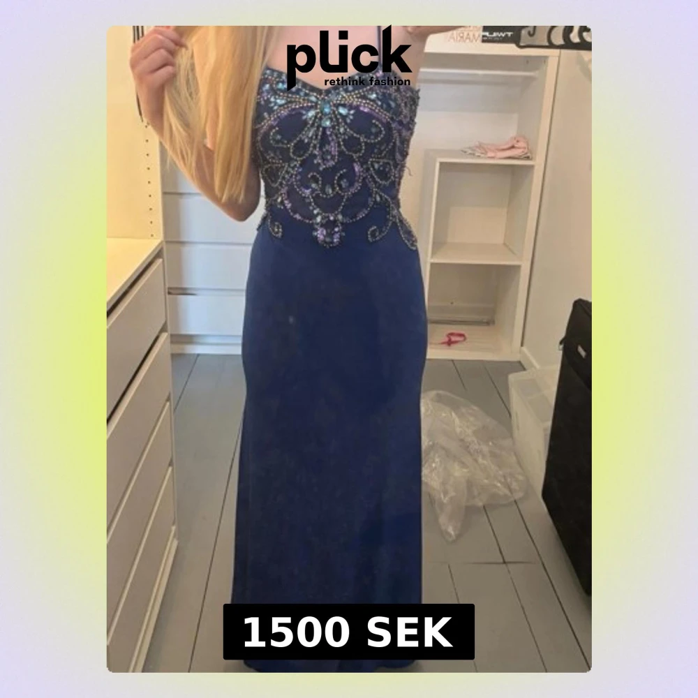Elegant blå långklänning med smala axelband och vackra paljettdetaljer över bysten och ryggen. Klänningen har figurnära passform upptill och faller rakt ner. Perfekt för bal, bröllop eller festliga tillfällen. Använd en gång på bröllop. Pris kan diskuteras.