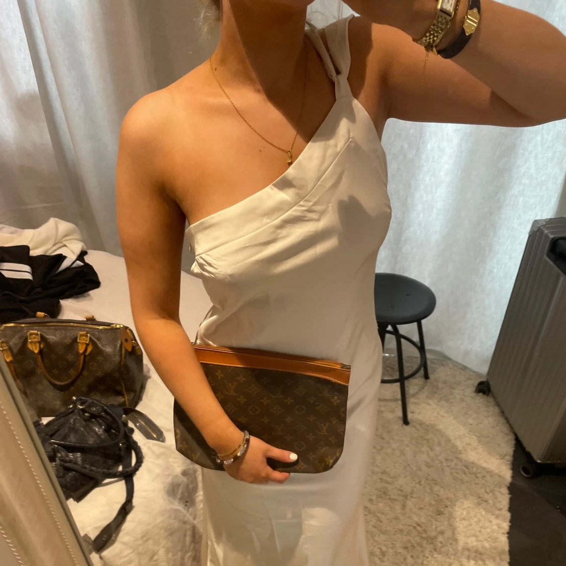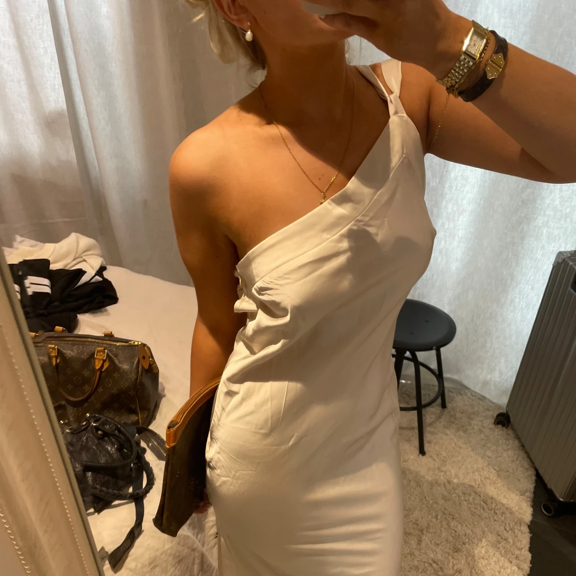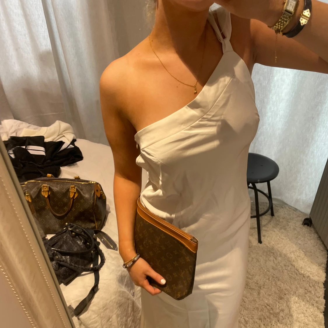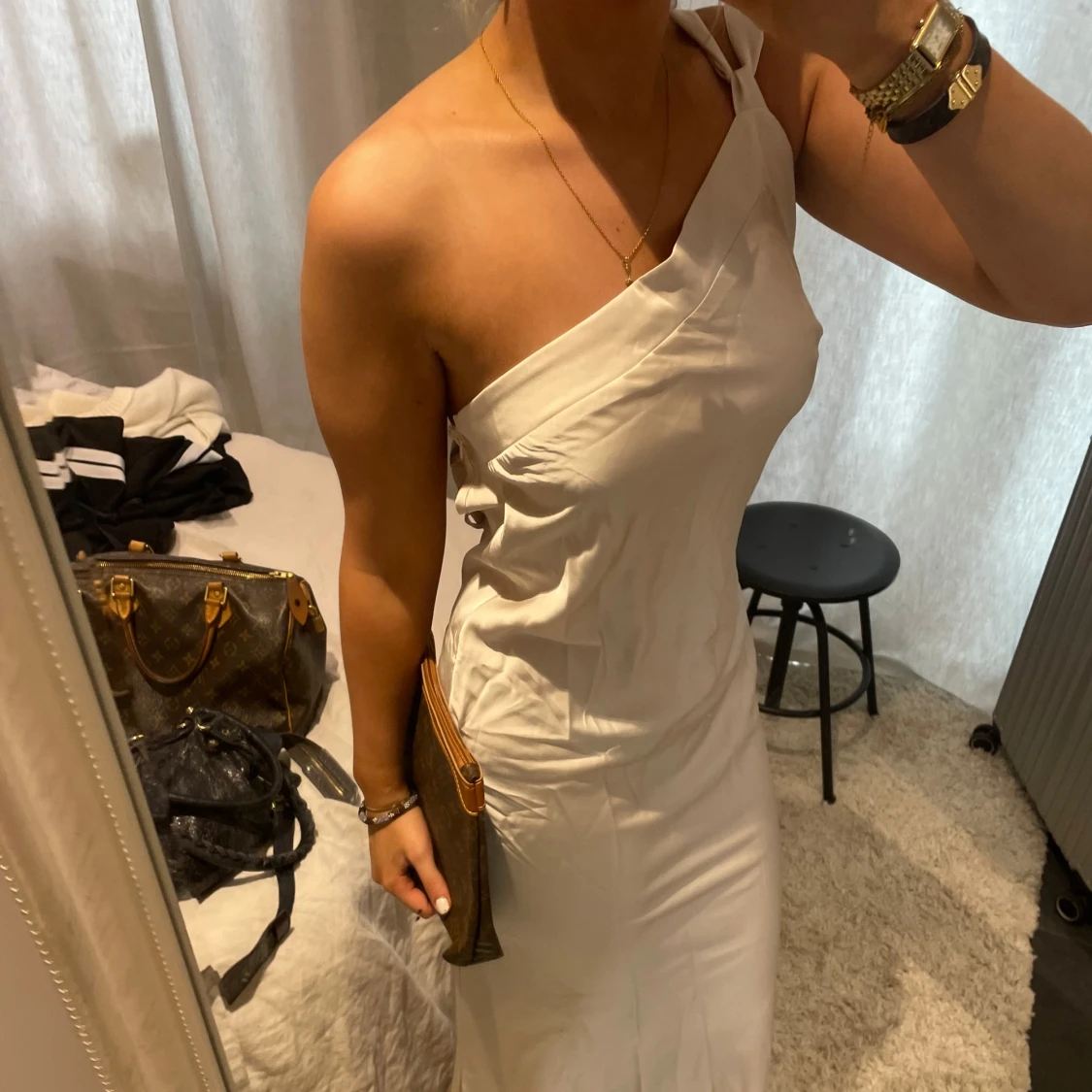 Kräm vit balklänning med en axel. Ryggen liknar bild tre, kan skicka fler bilder privat 🤎🤎 köpt på en australiensk sida för 2200!! Super bra kvalitet 🤎