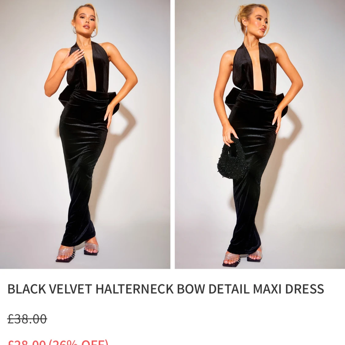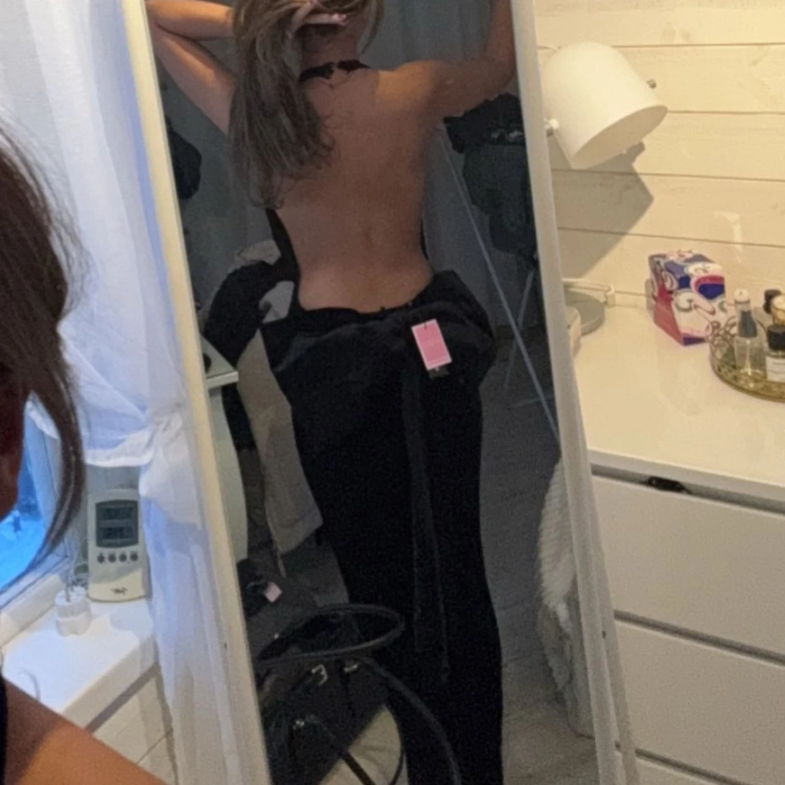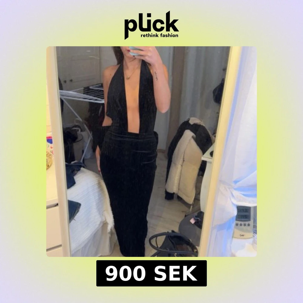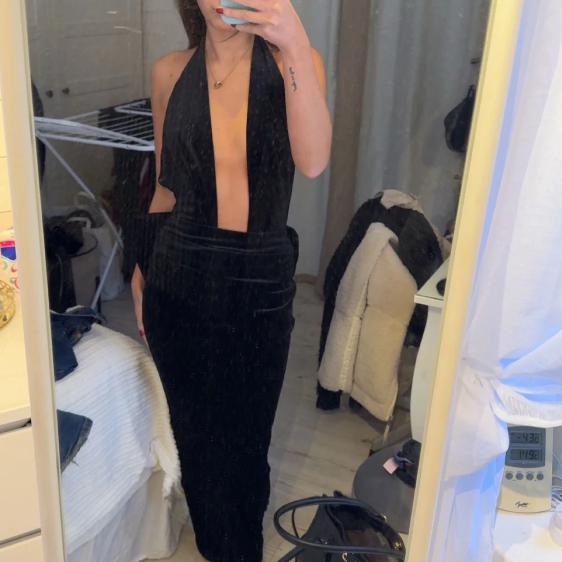 Snygg svart långklänning med djup urringning och öppen rygg. Perfekt för en elegant kväll. Klänningen har en åtsittande passform och är tillverkad i ett mjukt material som ger en lyxig känsla. Aldrig använts och är i bra skick!💕🥰
