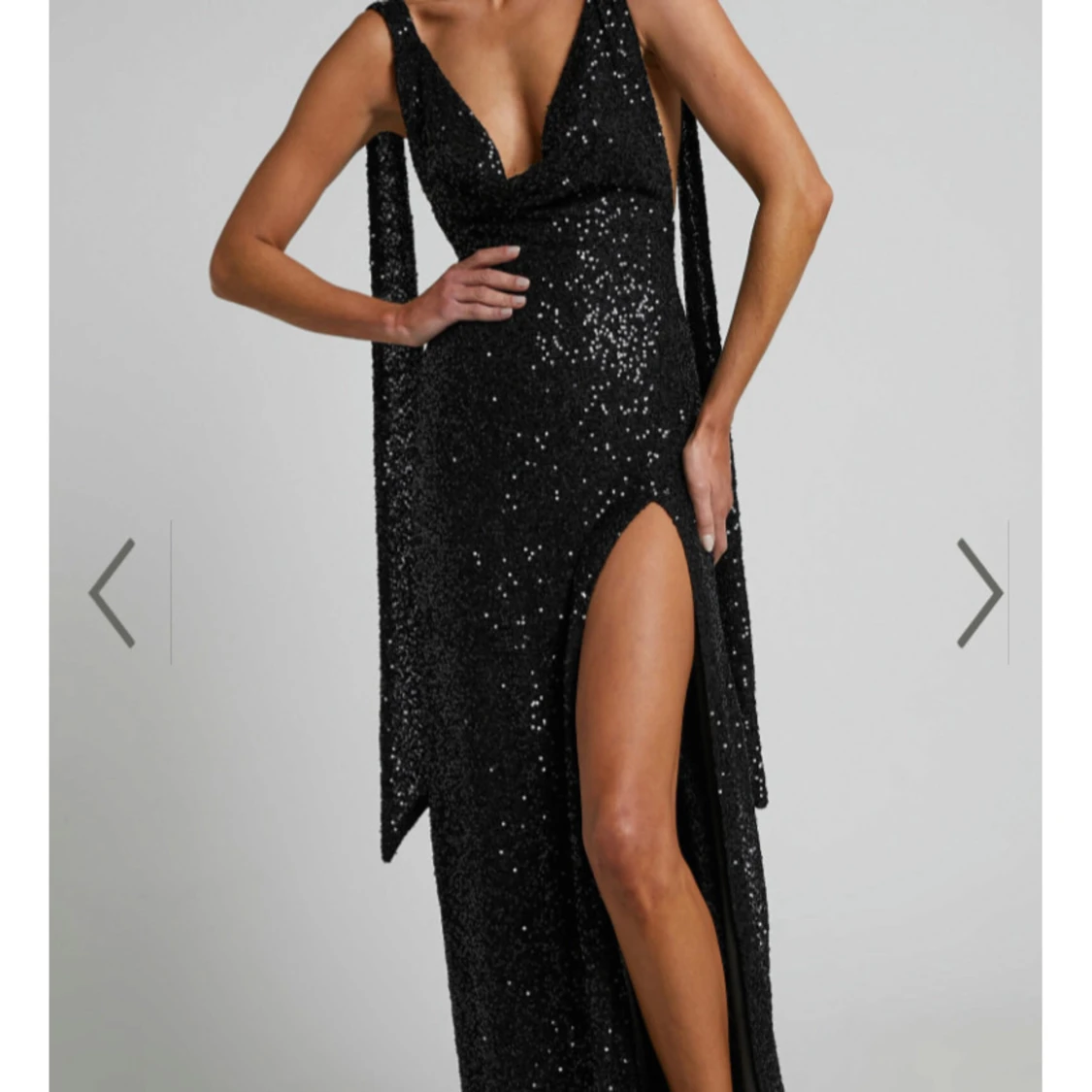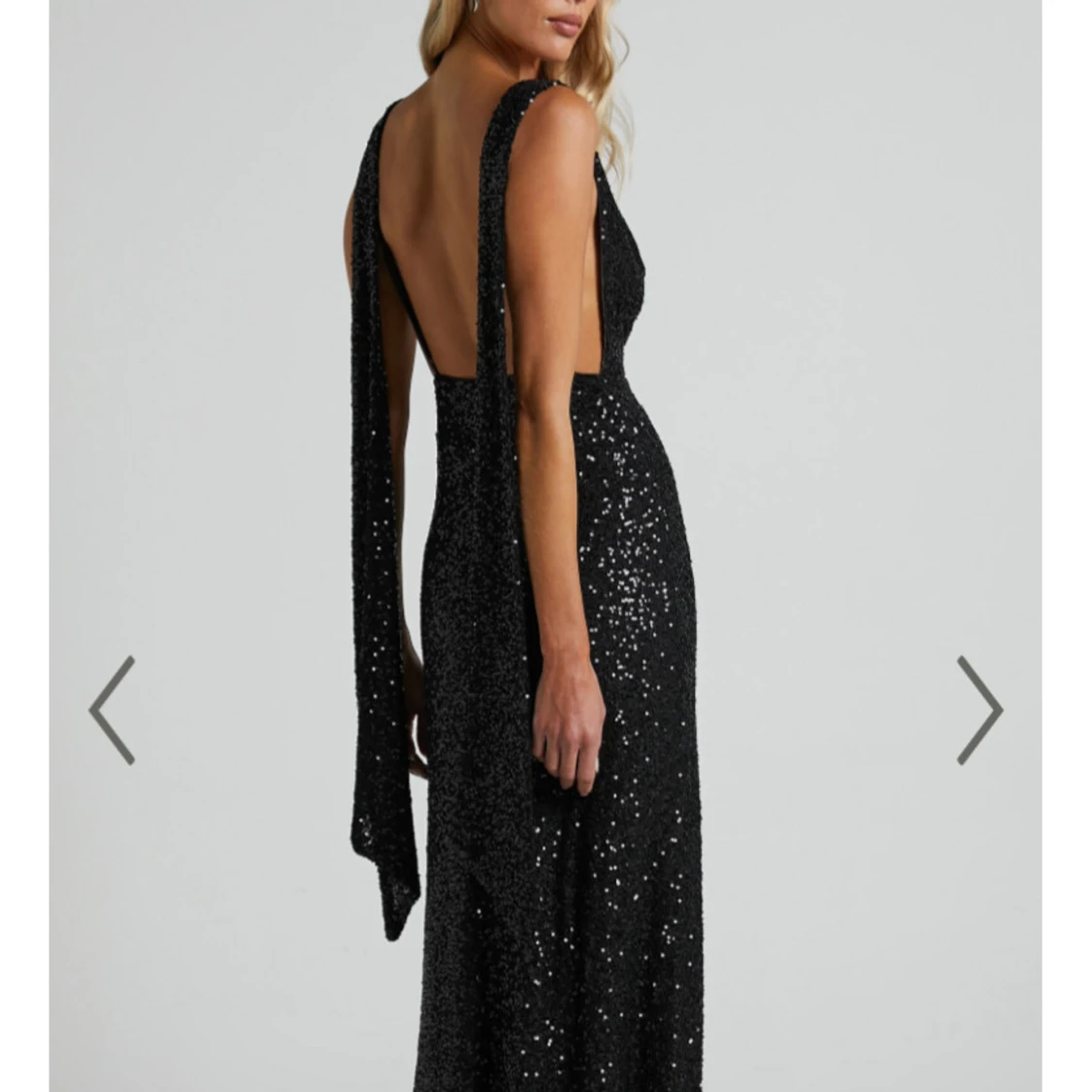 Svart balklänning med paljetter i stl 38 från Showpo, slits & öppen rygg. Det går att justera hur djupt man vill att urringningen ska gå 🖤använd 1 gång, är 170 lång för referens