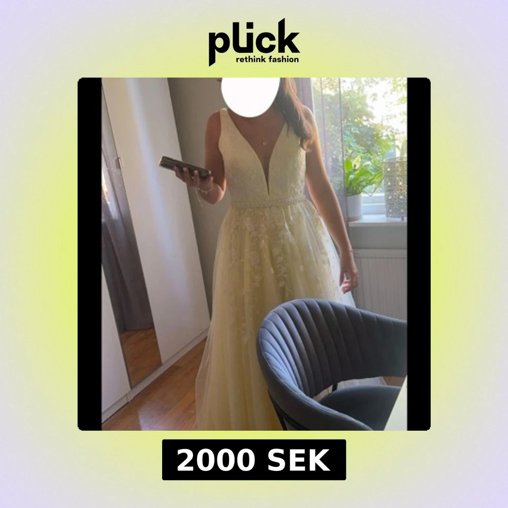 Jätte fin ljusgul lång balklänning med djup v-ringning och spetsdetaljer upptill. Klänningen har markerad midja med pärlband, lätt utställt kjolparti med blommigt mönster. Perfekt för bal eller student❤️ Hör av er ifall ni har frågor om mått osv