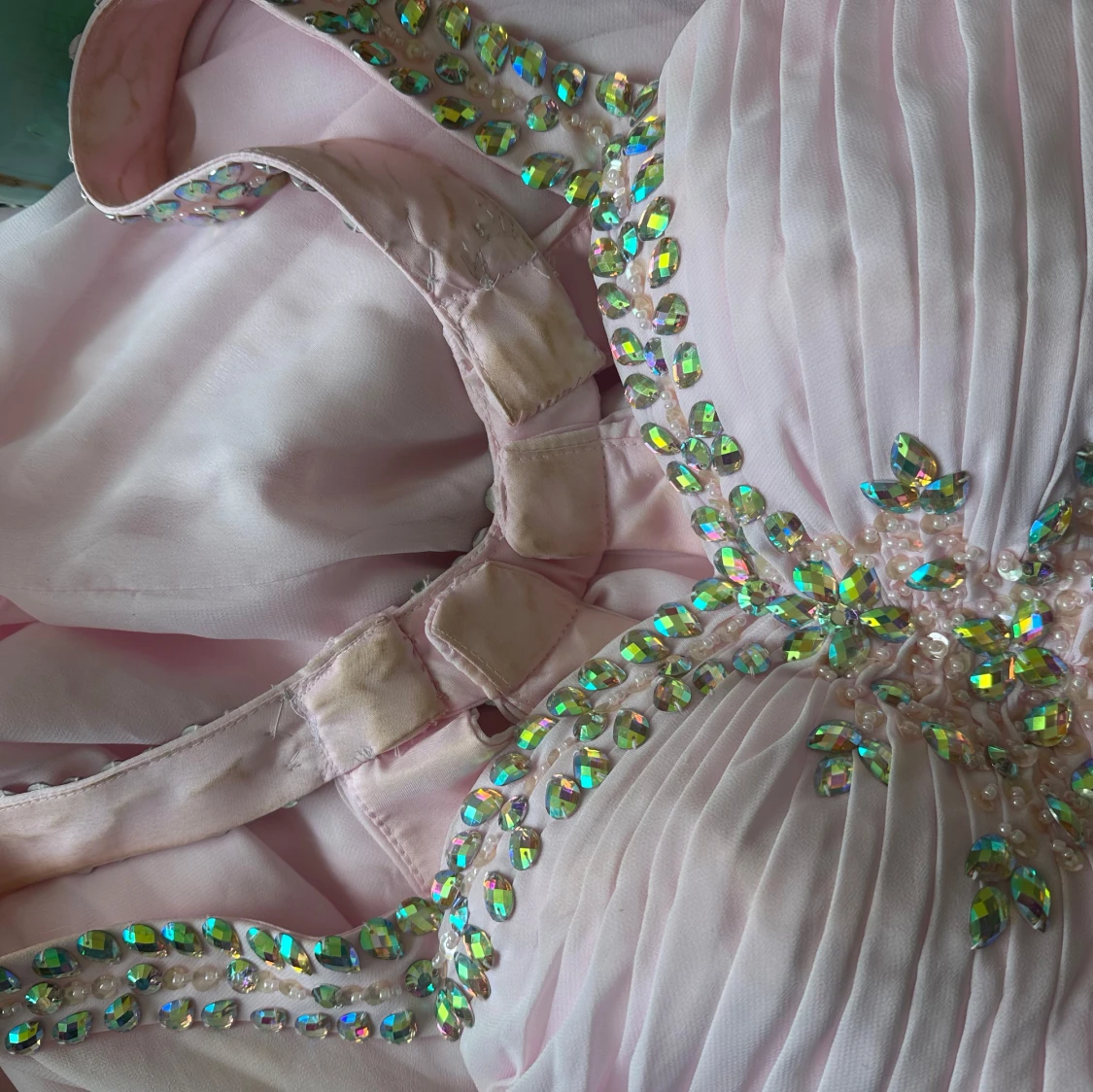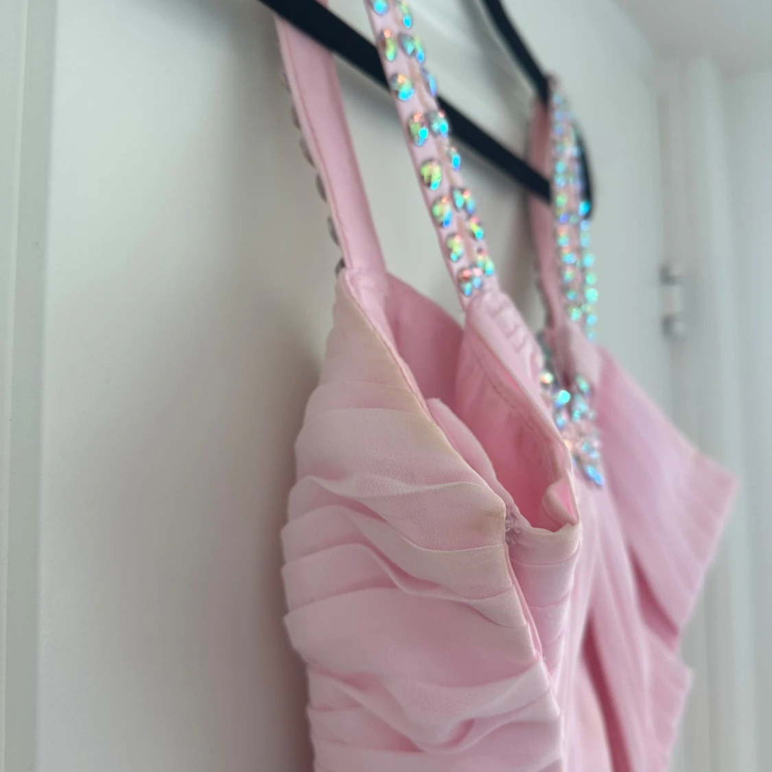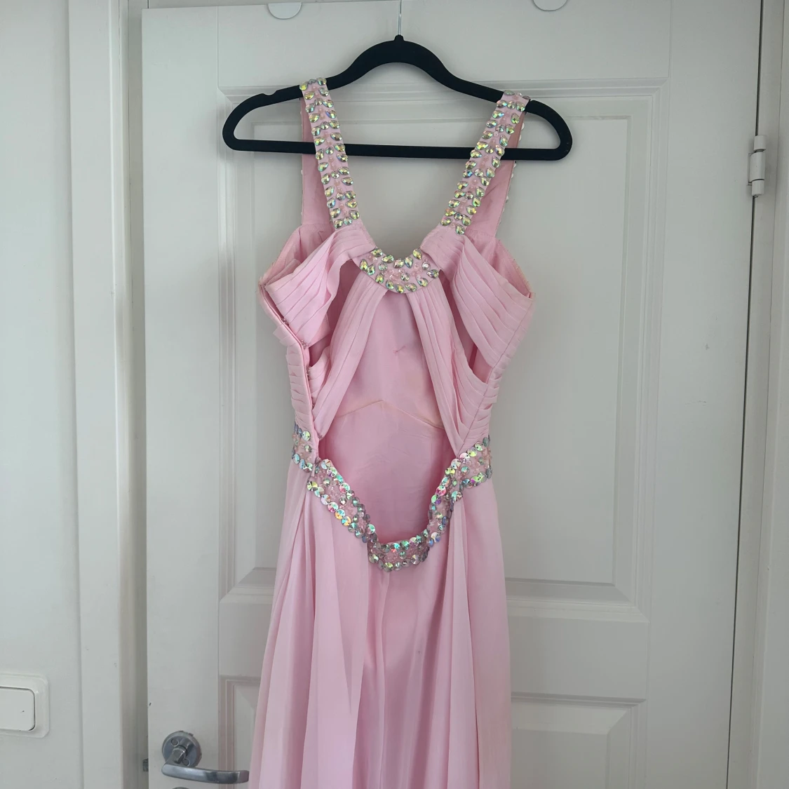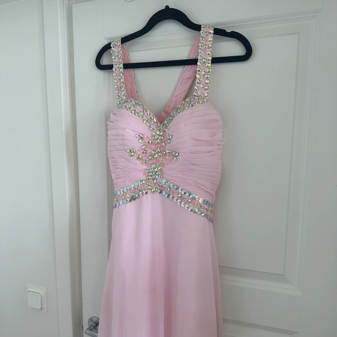 En rosa jättefin balklänning med strass på. Den är sydd men har ingen lapp, skulle säga den passar XS/S. Den har fläckar av brun utan sol på, har inte testat att ta bort dom.