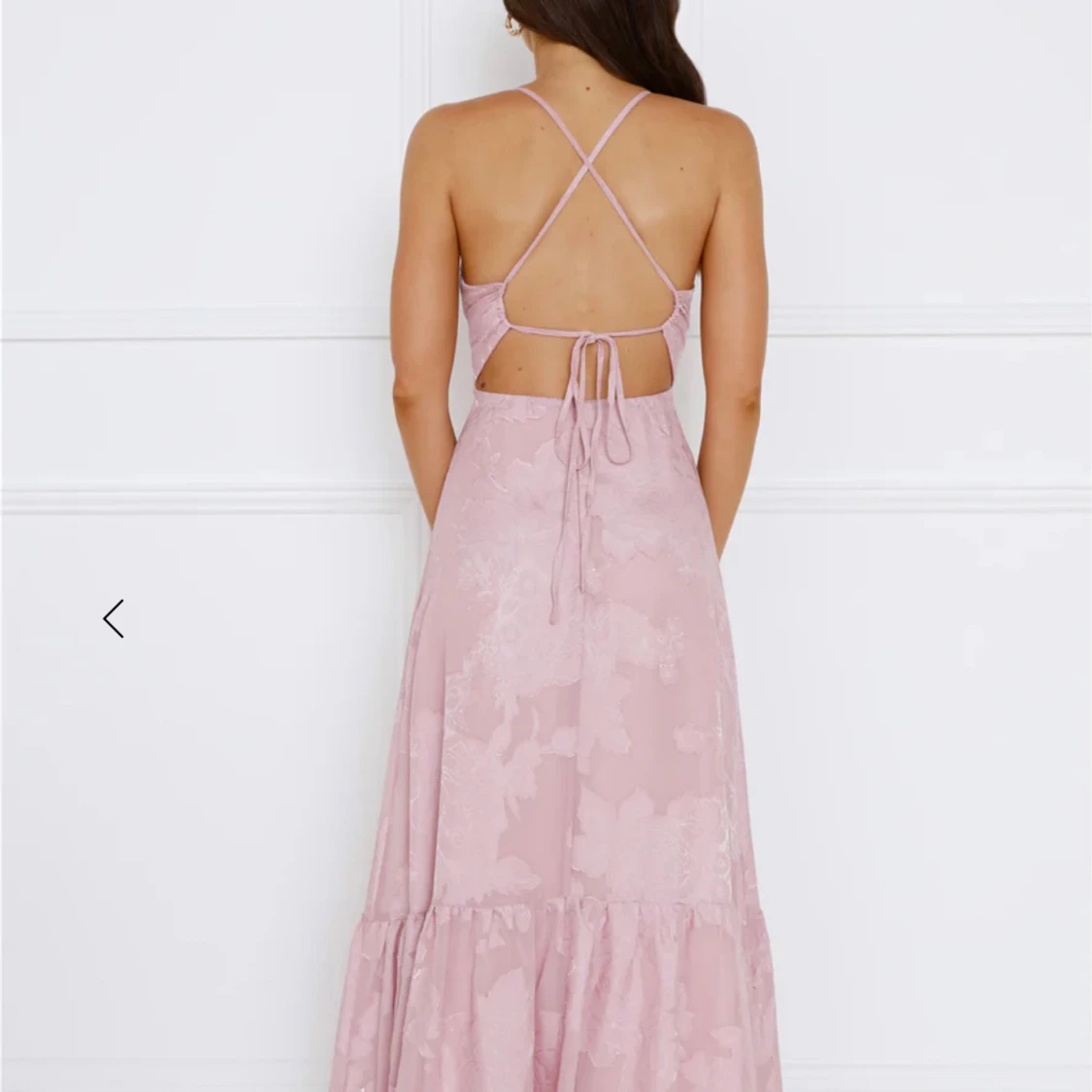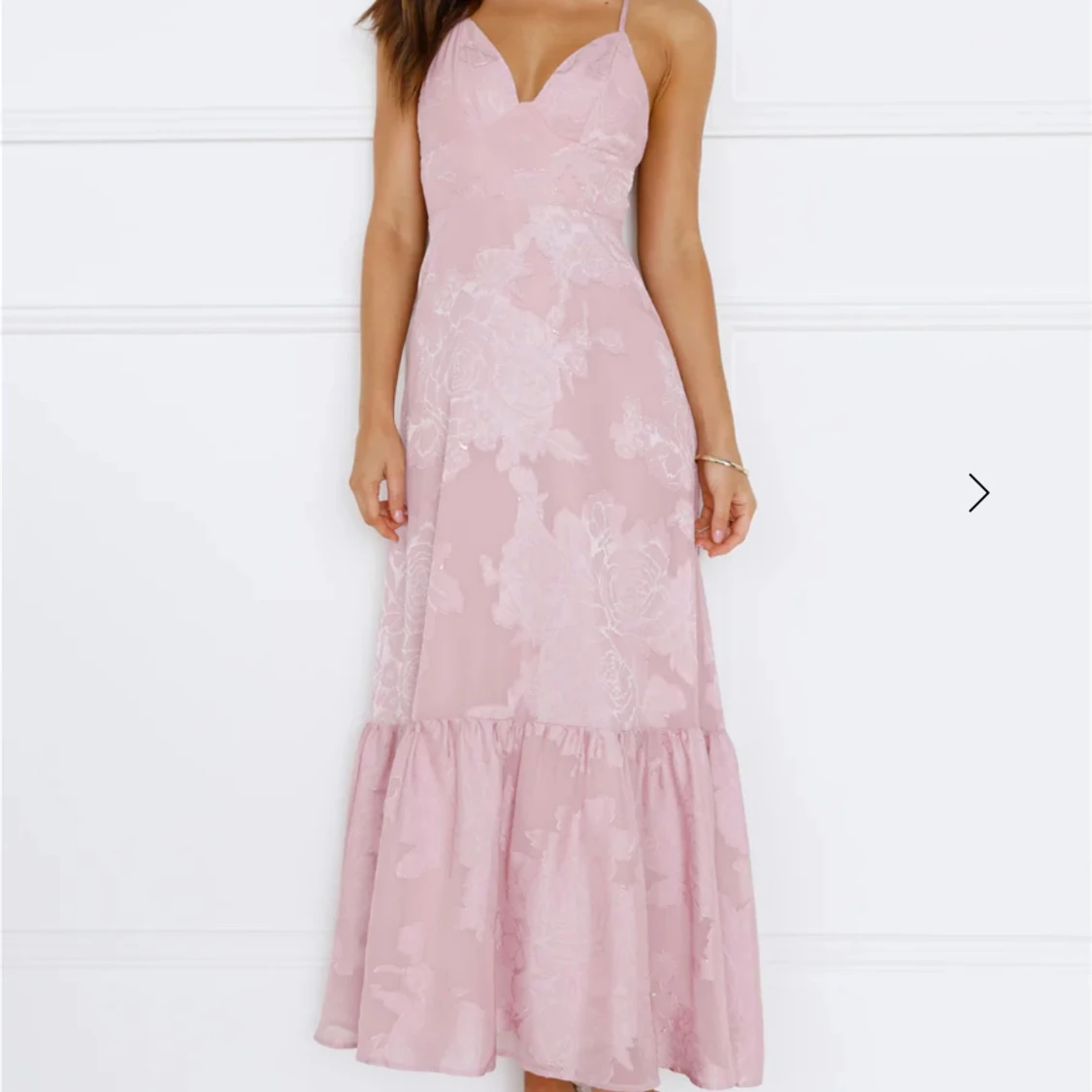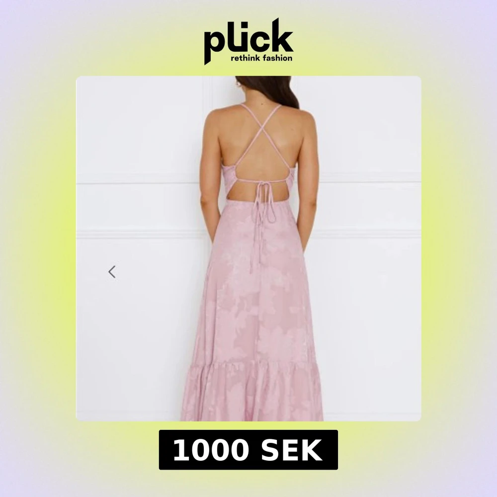 Superfin ljusrosa långklänning från Hello Molly med tunna axelband som korsas i ryggen och knyts. Klänningen har v-ringning, volang nertill och ett subtilt blommigt mönster. Perfekt för sommaren eller baler nu till hösten. Helt oanvänd. Köpt för 1300kr + frakt 🤍