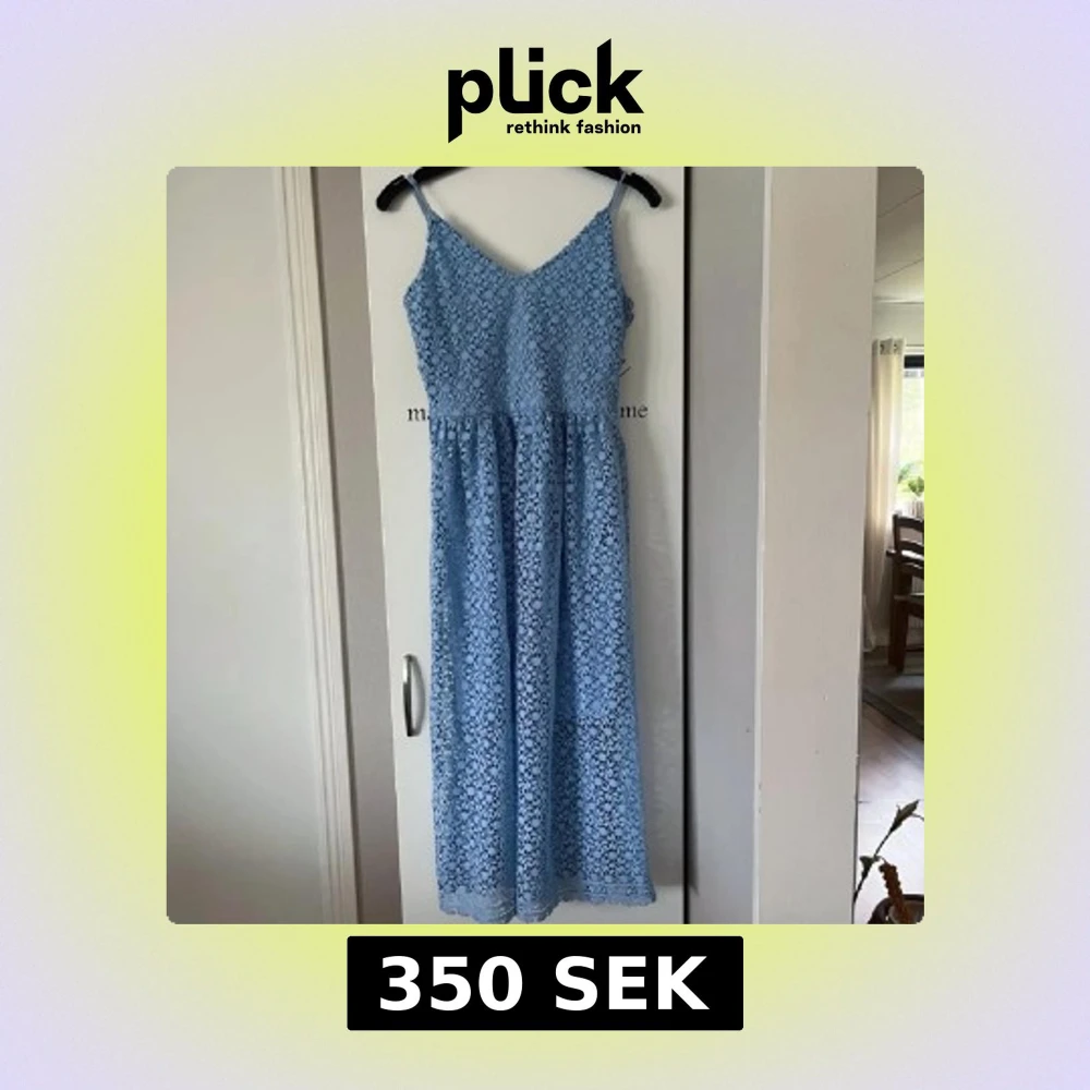 Superfin balklänning i ljusblått med blommigt spets tyg och underkjol. Smala axelband och v-ringad. På bilden var jag 1,58. Endast använd en gång. Skriv gärna vid önskan av fler bilder eller mått! 🩵
