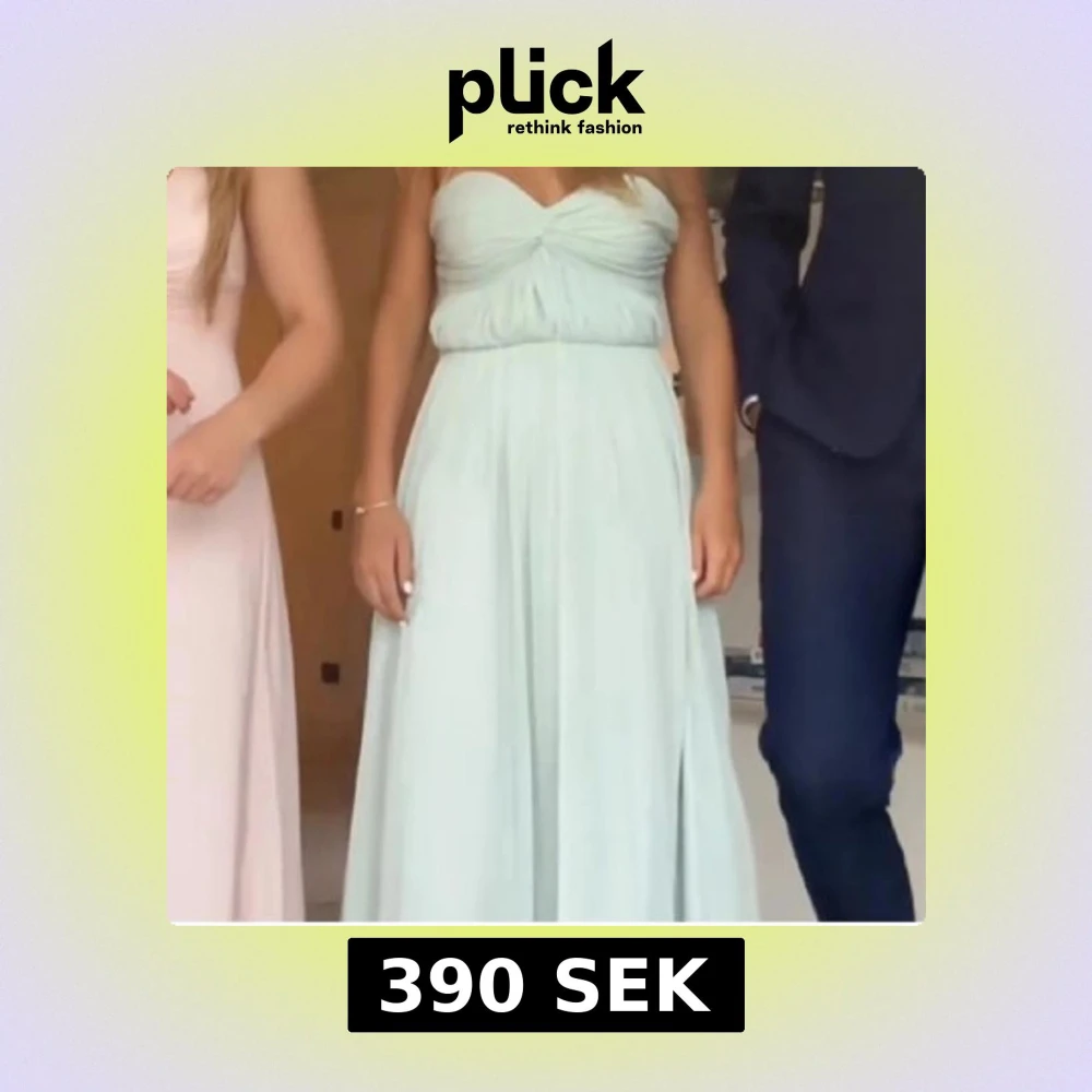 Superfin mintgrön balklänning med axelbandslös design och twistad drapering över bysten. Klänningen har ett flowy fall och är perfekt för bal eller student. Materialet känns lätt och luftigt, vilket ger en elegant look.