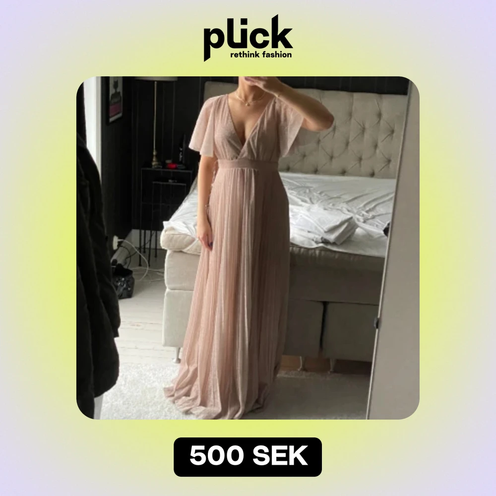 Champange/smutstosa balklänning från Bubbleroom med öppen rygg och V-ringad. Ej använd utan endast testad. Det är ett pyttelitet hål längst ner vid kanten men det syns verkligen inte när den är på, se sista bilden