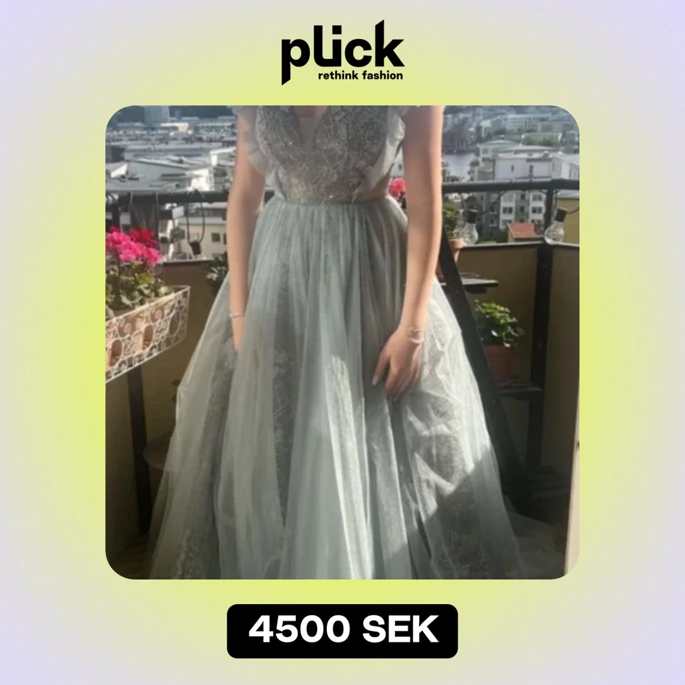 Superfin klänning i tyll, jadegrön -ljusgrå melerad med fantastiska detaljer. Endast använd 1 gång, nypris 7500kr, köpt på SE Fashion i Södertälje.