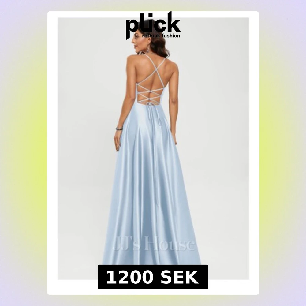 Säljer en jättefin ljusblå långklänning i glansigt satinliknande material. Klänningen har omlottliv, v-ringning och smala axelband med snygg snörning i ryggen. Betalade 1800 för klänningen och 900 för att sy upp den då den var för lång. Jag är 162cm och har klackar på bilderna💗