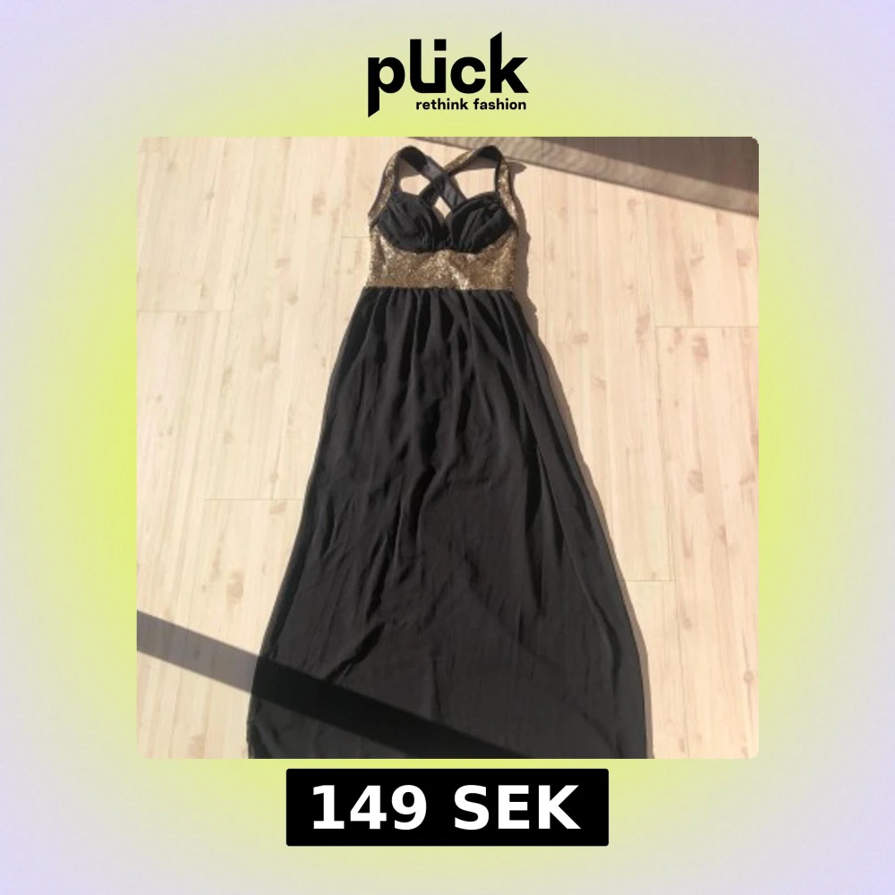Svart lång balklänning med guldpaljetter på överdelen och korsade axelband
