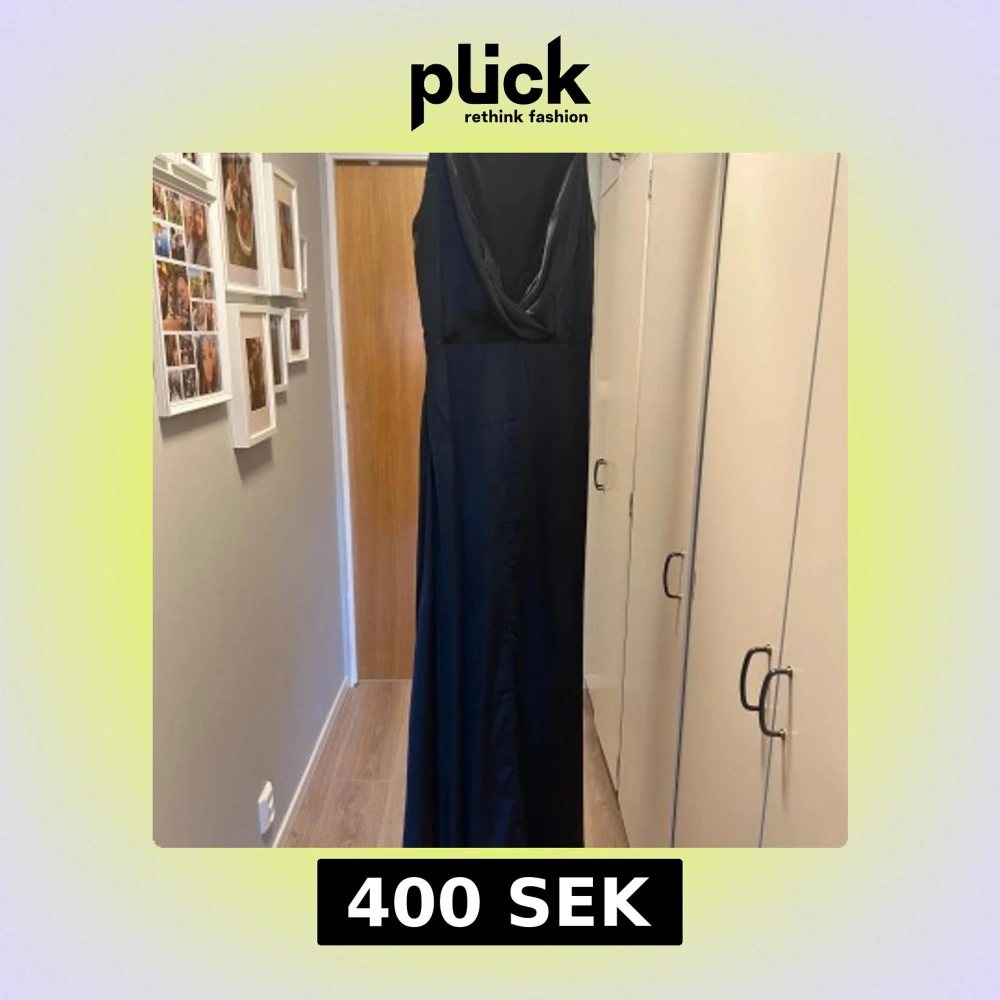 Elegant svart långklänning i satin med en djup v-ringad rygg och smala axelband. Klänningen har en hög slits framtill som ger en sofistikerad touch. Perfekt för speciella tillfällen. Djur och rökfritt hem, använd endast vid ett tillfälle.