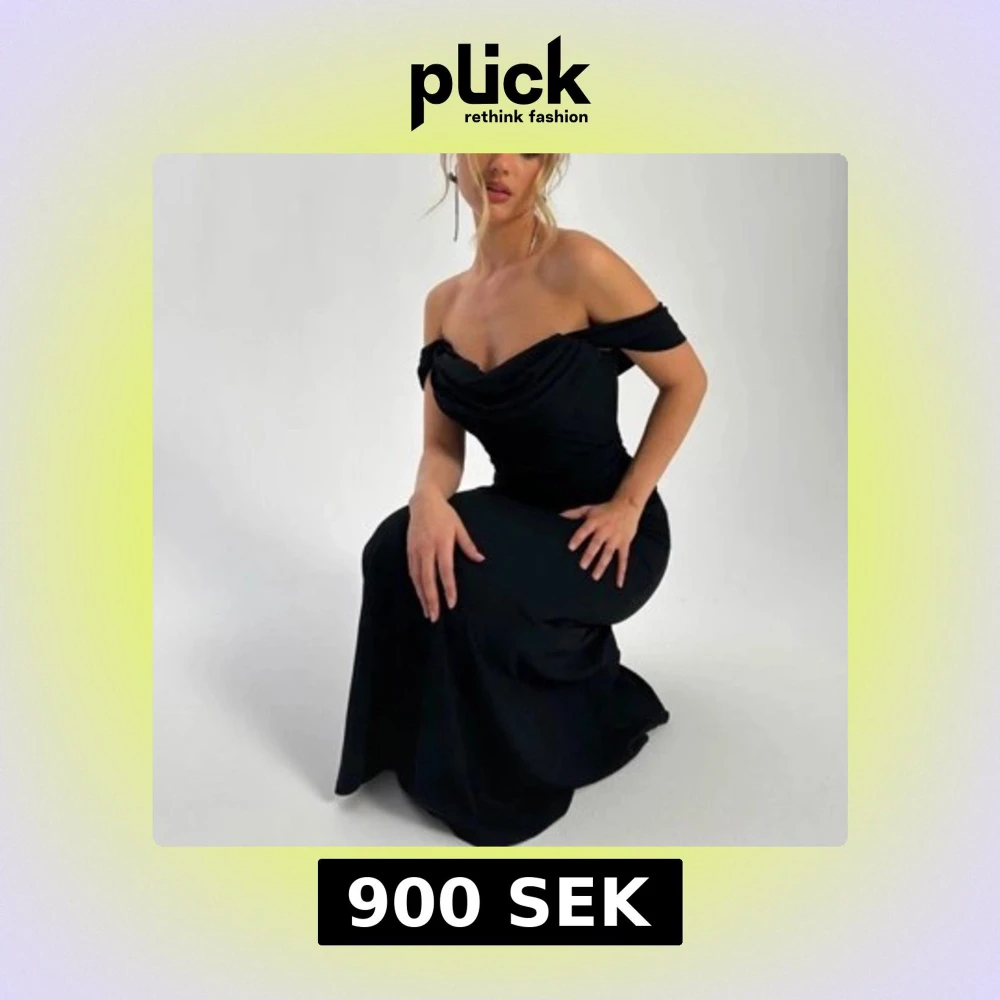 Elegant svart långklänning med offshoulder-design och draperad överdel. Klänningen har en figurnära passform upptill och faller snyggt längs kroppen. Perfekt för festliga tillfällen. (Kostar egentligen 1099)