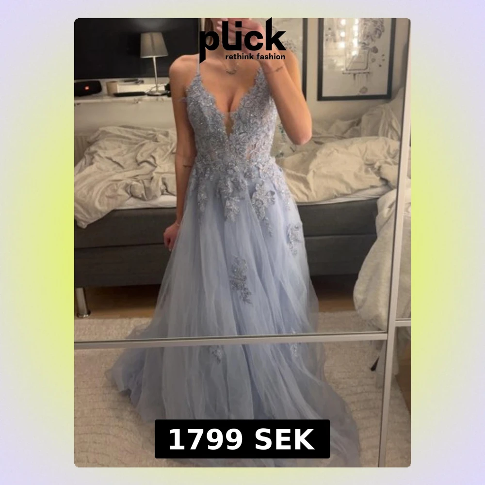 Elegant ljusblå långklänning med tunna axelband, djup v-ringning och vackra spetsapplikationer. Klänningen har snörning i ryggen och är tillverkad i ett tunt, flowy material som ger en drömmig känsla. Perfekt för bal eller student.