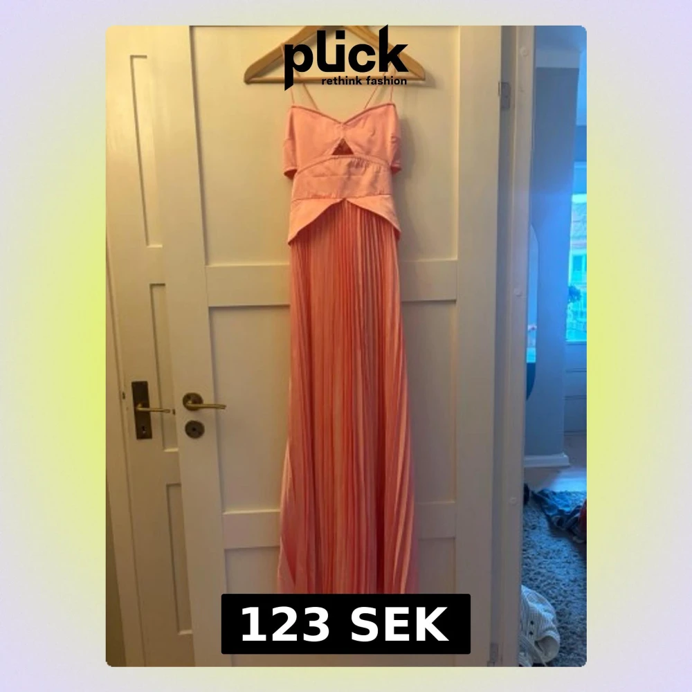 Intressekoll på min balklänning från 9an bal🩷lång rosa klänning med smala axelband och plisserad kjol. Klänningen har en snygg cut-out detalj framtill och omlottliknande överdel. Den är i stolek XS och perfekt längd på mig som är 165. Priset skulle ligga på ungefär 1550❣️
