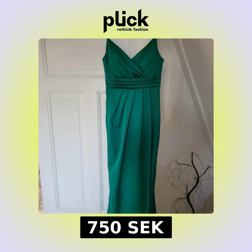 Elegant grön balklänning med v-ringad hals och smala axelband med draperad design i midjan. Balklänningen är endast använd på balen en gång. Jag som haft klänningen på mig är 165 cm och klänningen är uppsydd hos skräddare med litet släpp så den passar bra med klackskor. På storleken i klänningen står 38 men den är liten i storlek och passar mig som vanligtvis har 32/34. 💕💕