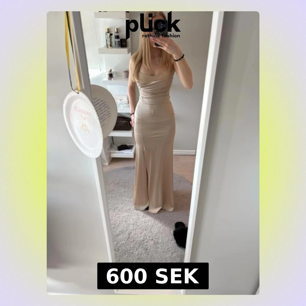 Elegant långklänning i champagnefärg med smickrande drapering och snörning i ryggen. Klänningen har smala axelband, öppen rygg och en figurnära passform. Perfekt för speciella tillfällen när du vill sticka ut.