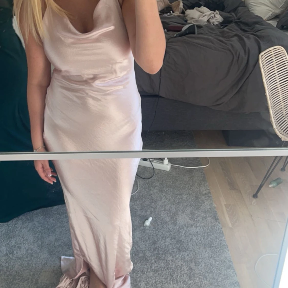 Elegant ljusrosa långklänning i siden med en vacker öppen rygg och snörning. Klänningen har en figurnära passform och är perfekt för festliga tillfällen. Den har en mjuk glans och smala axelband som korsas i ryggen.