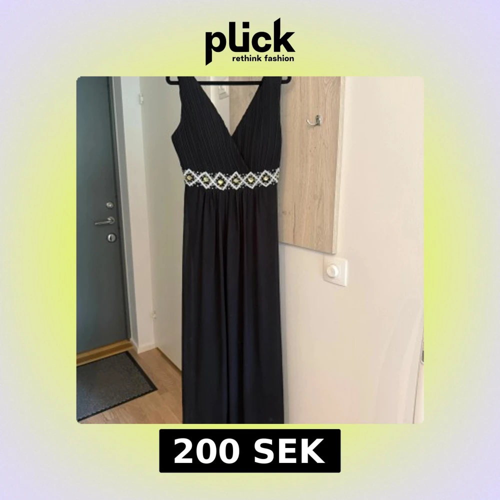 Elegant svart långklänning från Flower by Ohara med v-ringad omlott-topp och pärldetaljer i midjan. Klänningen har smala axelband och ett fint fall, perfekt för festliga tillfällen.