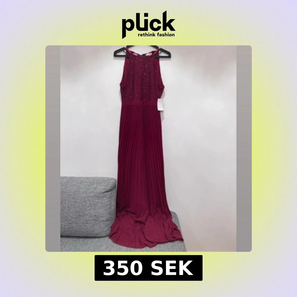 Elegant vinröd långklänning med spetsliv och plisserad kjol. Klänningen har hög halsringning, vackra knytband i ryggen och är ärmlös. Perfekt för festliga tillfällen där du vill sticka ut.