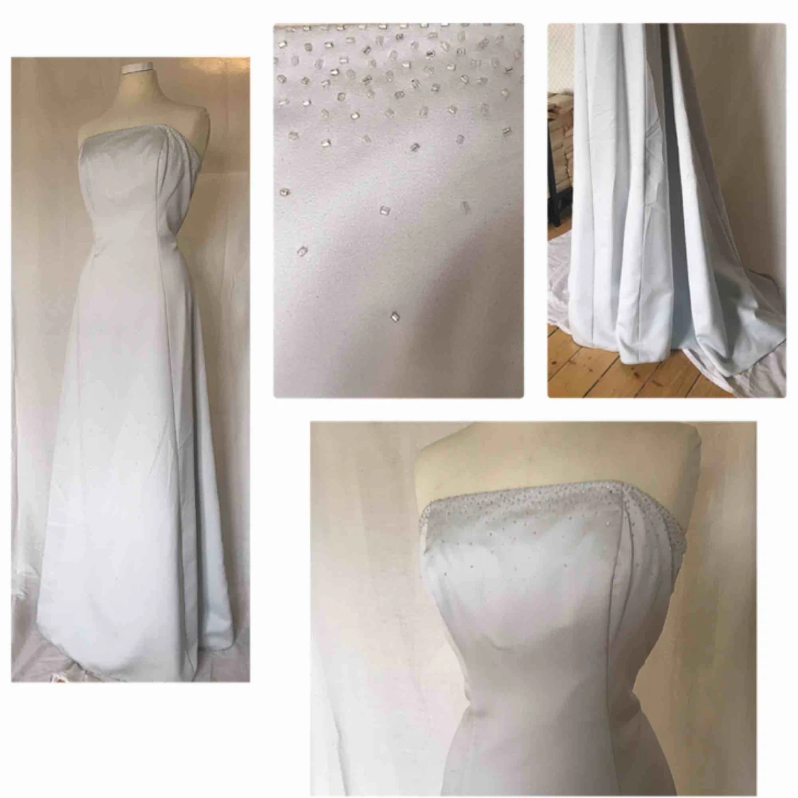 Supervacker balklänning med elegant släp Färgen är ljust ljust blå, skulle även fungera som bröllopsklänning 🌸 Finns hakar ifall man vill köpa till egna axelband Priset kan diskutera vid snabb affär!