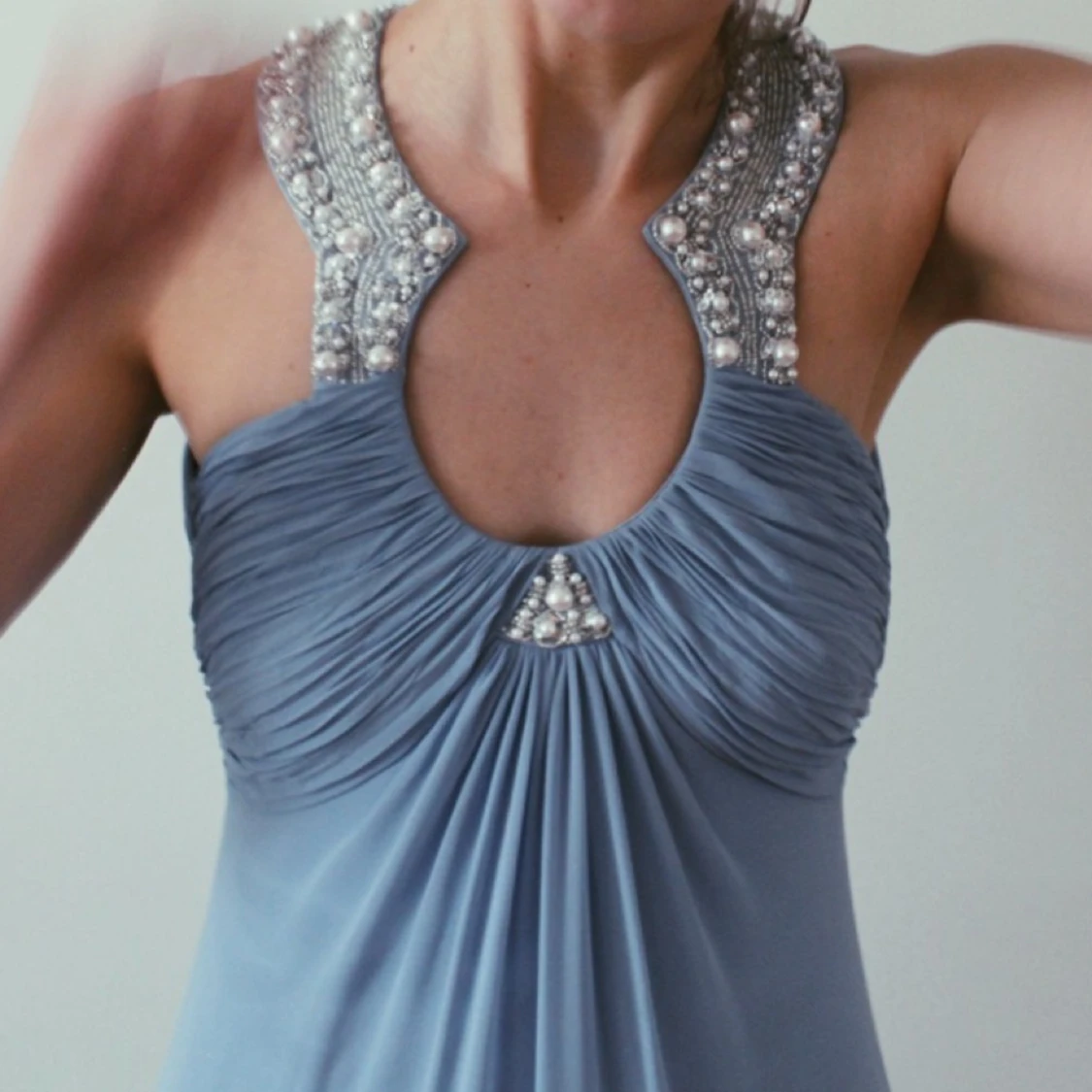 Balklänning Ljusblå klänning med fina pärldetaljer. Djupgående rygg med drapering, fint fall. Använd en gång 100% polyester En skadad knapp i nacken, kan enkelt ersättas för hand. Finns i Stockholm annars tillkommer frakt.