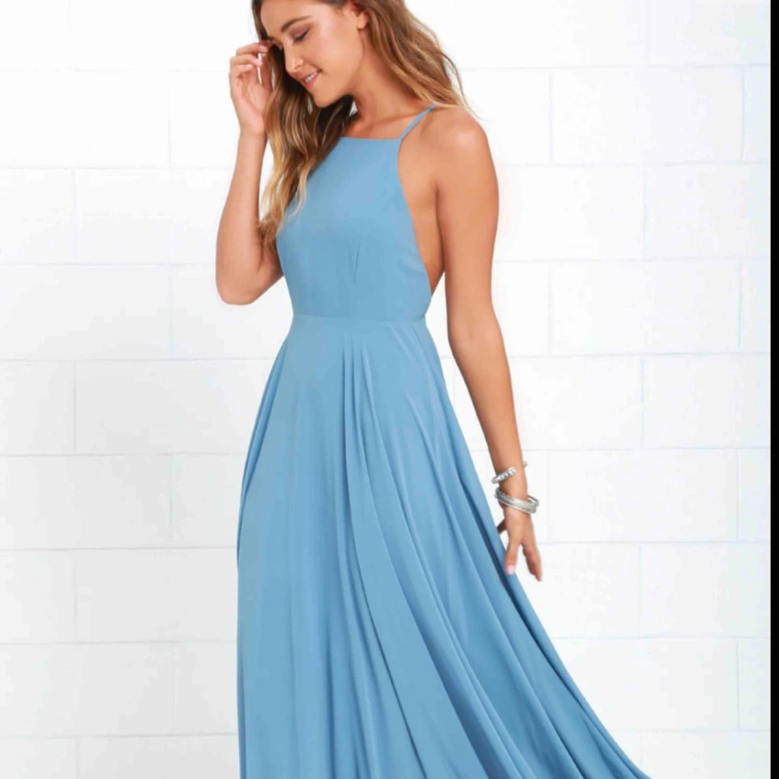 Väldigt fin fest/balklänning i en fin blå färg med korsade justerbara smala band i ryggen.